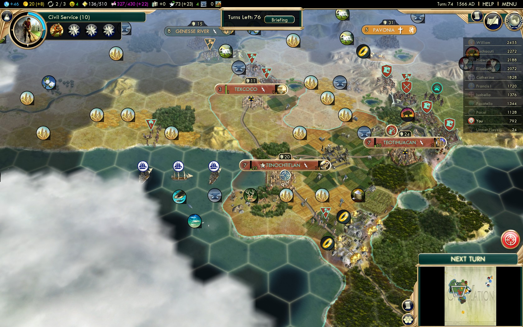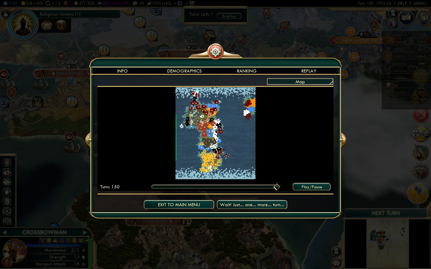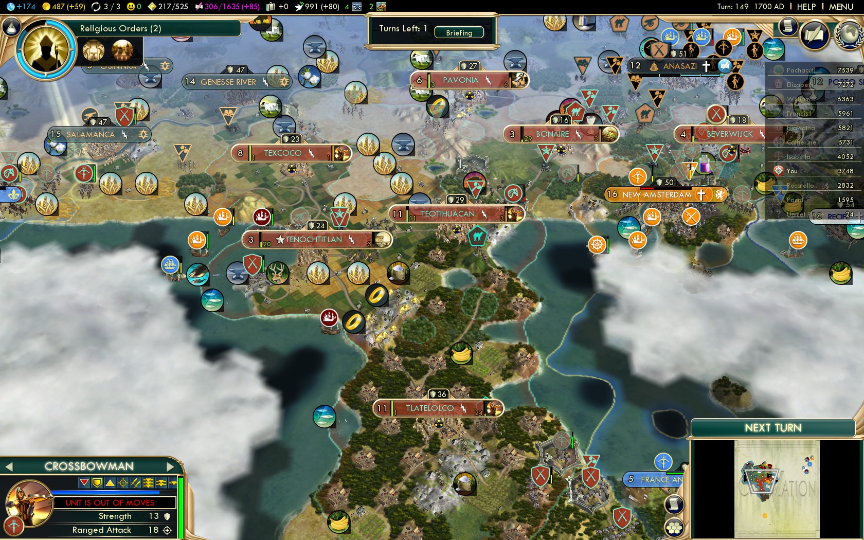In above attempt I waged a draining war against the Iroquois in the South. This time, playing the same map (loading the initial save game) I settled south of the choke point, kept them at bay with a citadel and eventually conquered most of them. What helps tremendously is building the Texcotzingo Wonder in the capital, granting +4 Faith (2 VP per turn) but more importantly +6 Food, which will grow your capital like nothing else.