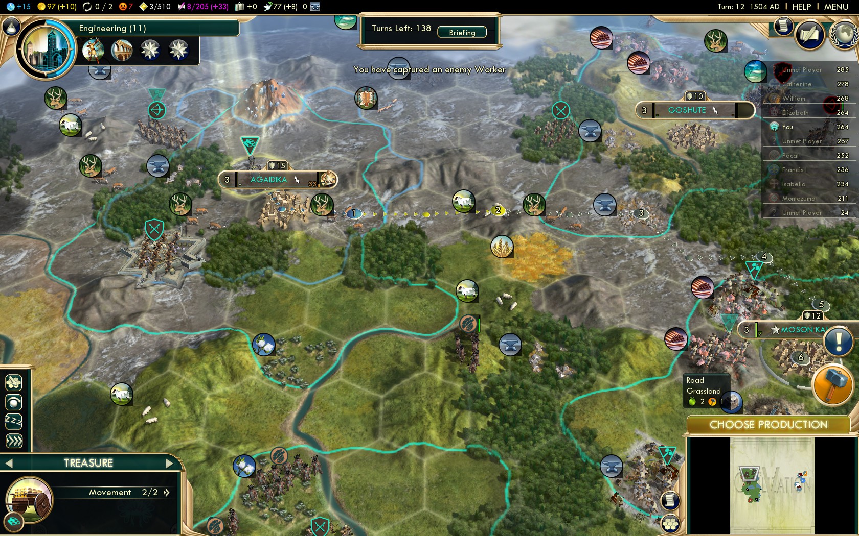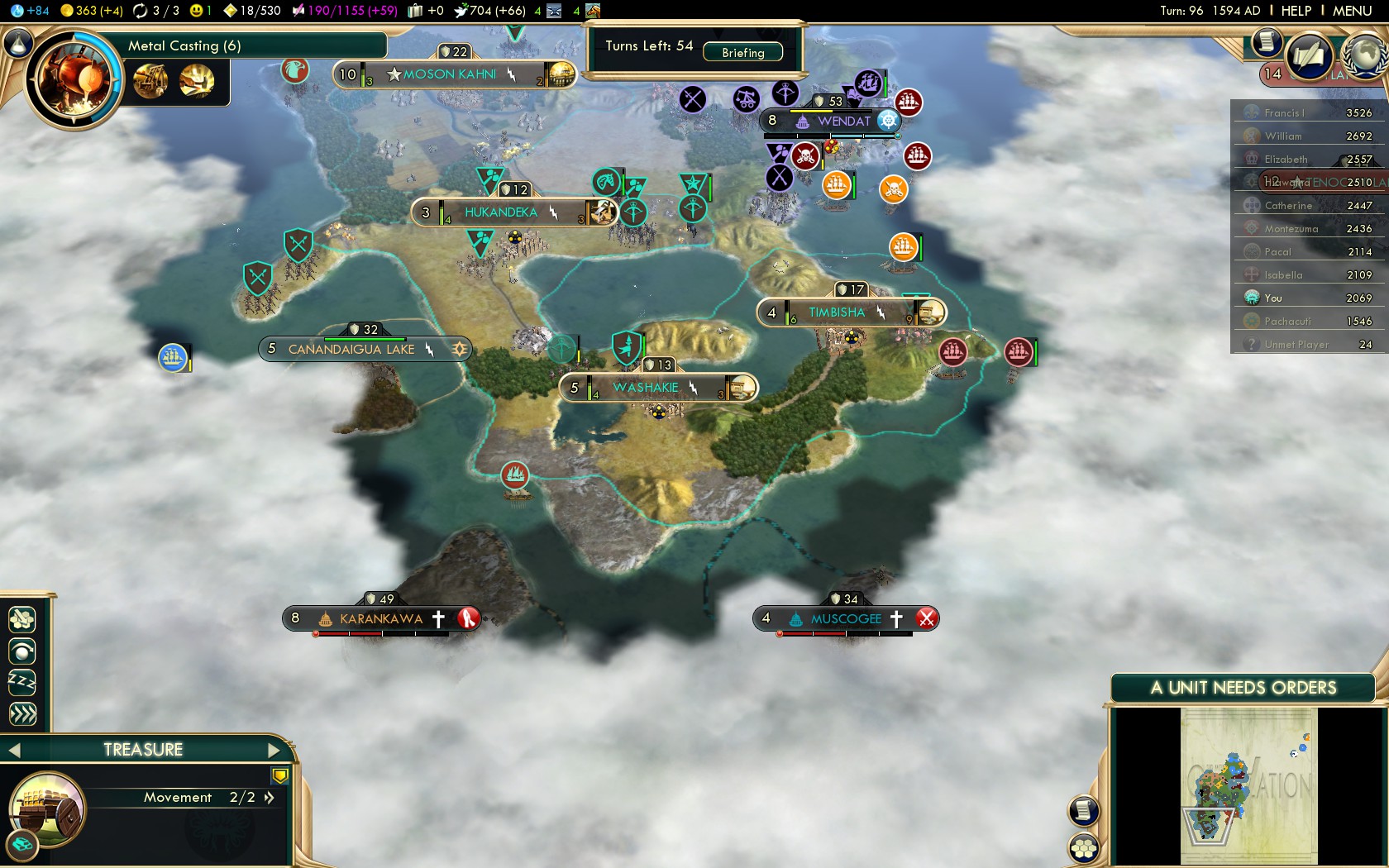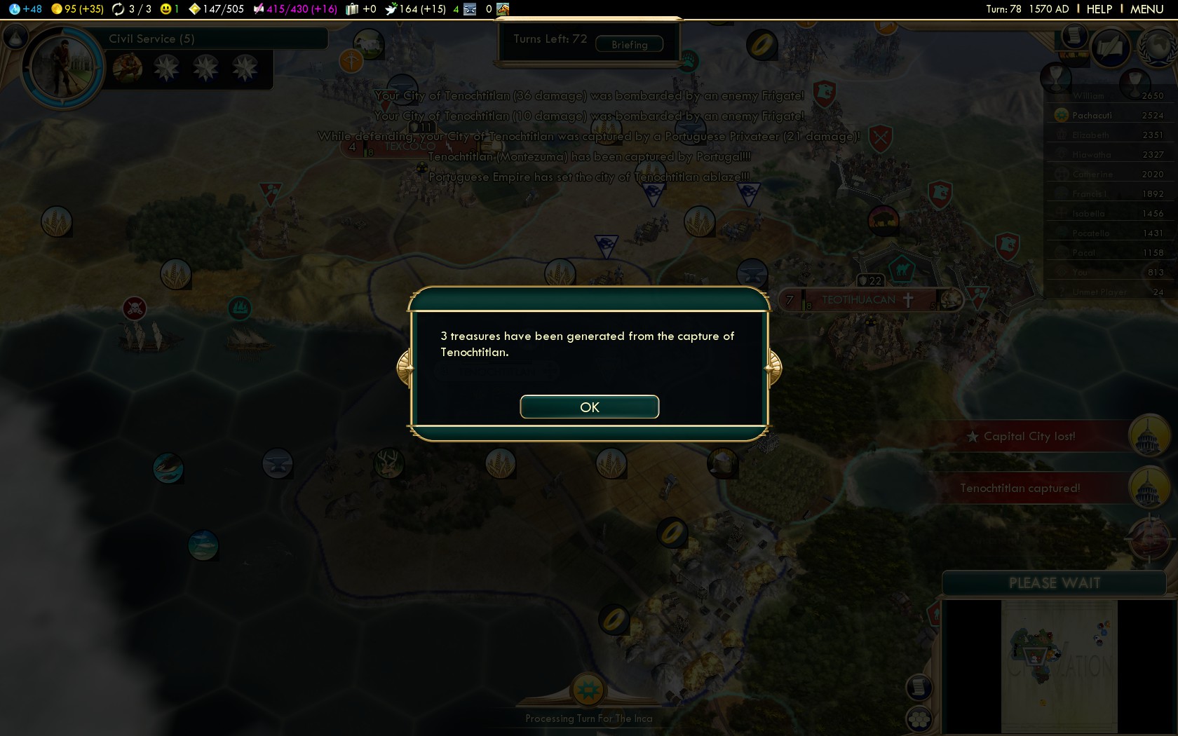 In above attempt I waged a draining war against the Iroquois in the South. This time, playing the same map (loading the initial save game) I settled south of the choke point, kept them at bay with a citadel and eventually conquered most of them. What helps tremendously is building the Texcotzingo Wonder in the capital, granting +4 Faith (2 VP per turn) but more importantly +6 Food, which will grow your capital like nothing else.