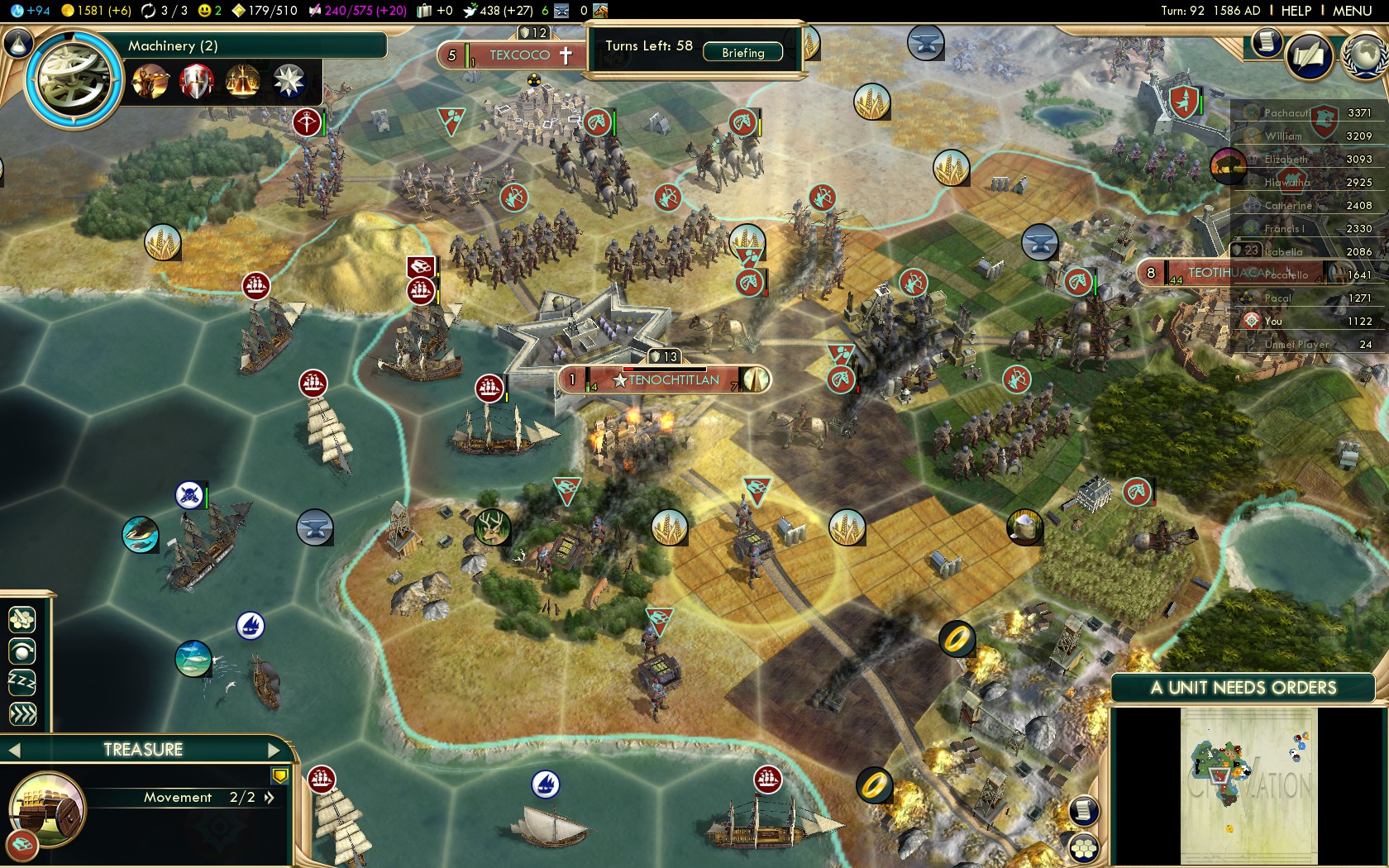 With them I was able to recapture Tenochtitlan every time. And I also captured all the treasures the Europeans generated so my Gold income was massive. In the end I had a reasonably sized army including some veteran crossbowmen, but all of that came much too late. Also the unmolested Inca had already outpaced everyone, because he was all alone in South America.