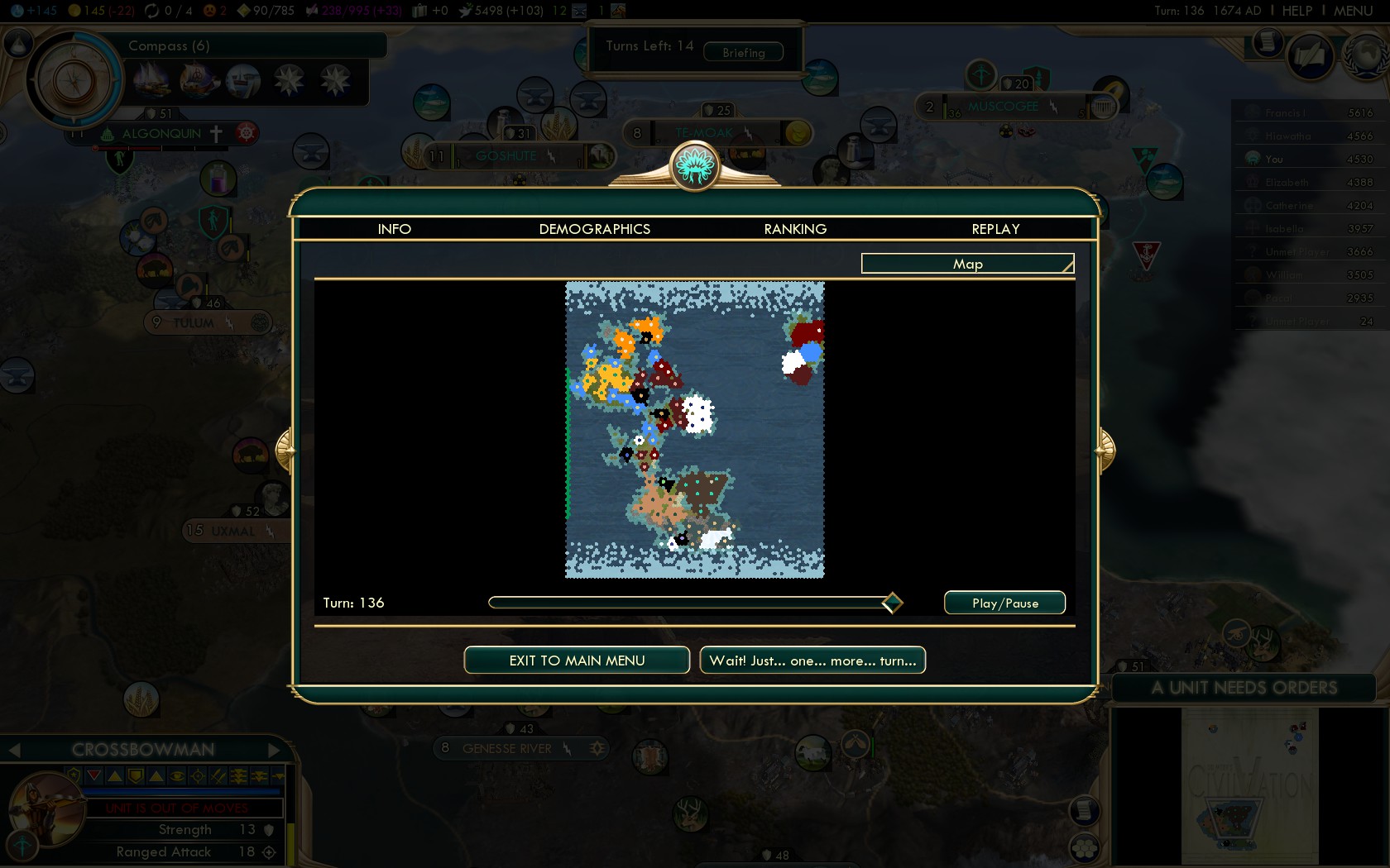 Sometimes even many cities on great land can not guarantee victory. In this game, the Europeans were all too dominant in the west with no AI Native being able to slow them down. In a game like this mostly Frances score increase tremendously every single turn with a human player being unable to close the gap.