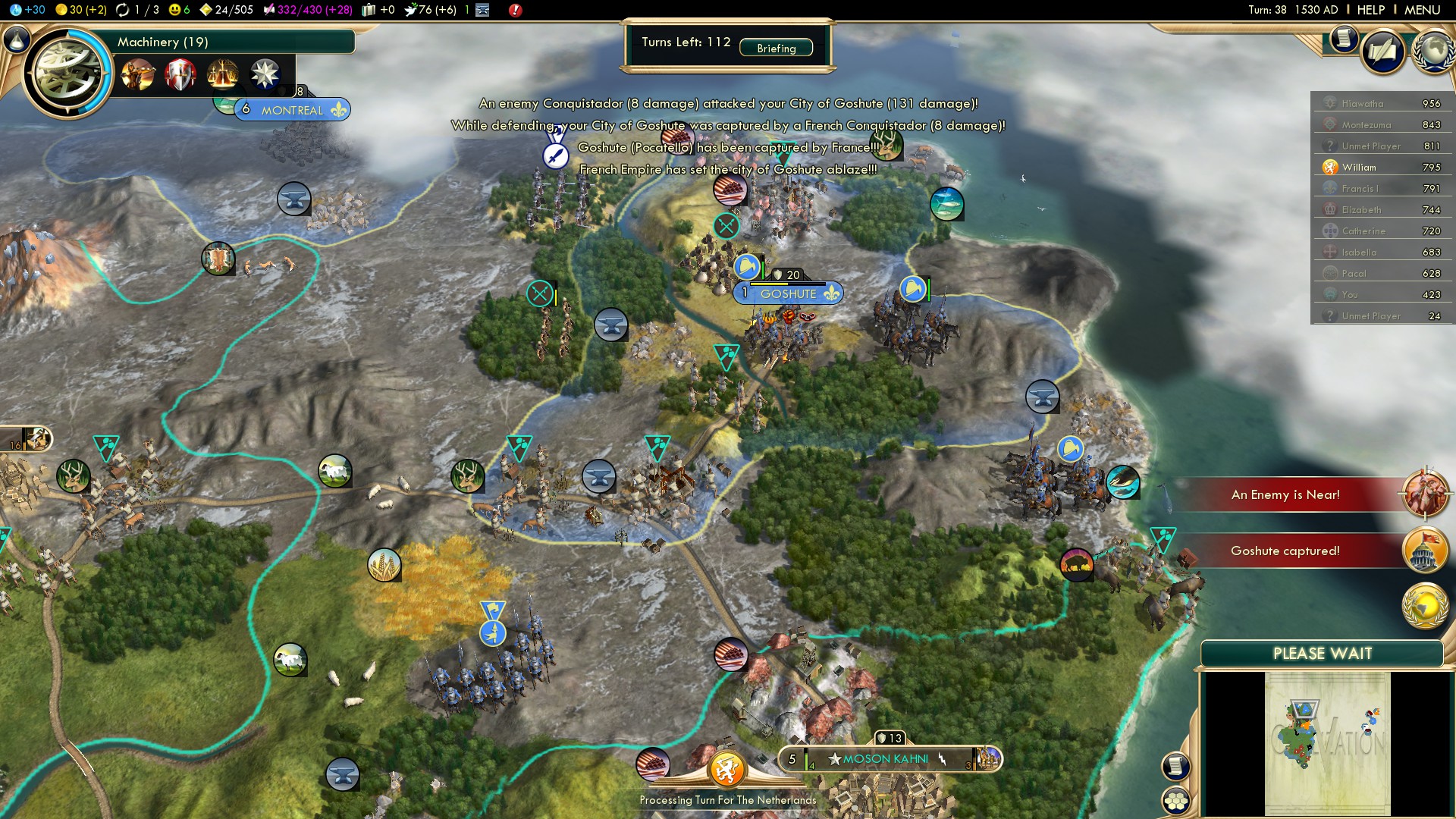 In my second try of this map I immediately declared war on the Mayans, keeping them at bay. Unfortunately I soon had to realize that my priorities were off: It was still North America so eventually the Europeans came for me. With 2 Conquistadores, France captured a city in one turn and I abandoned this game.