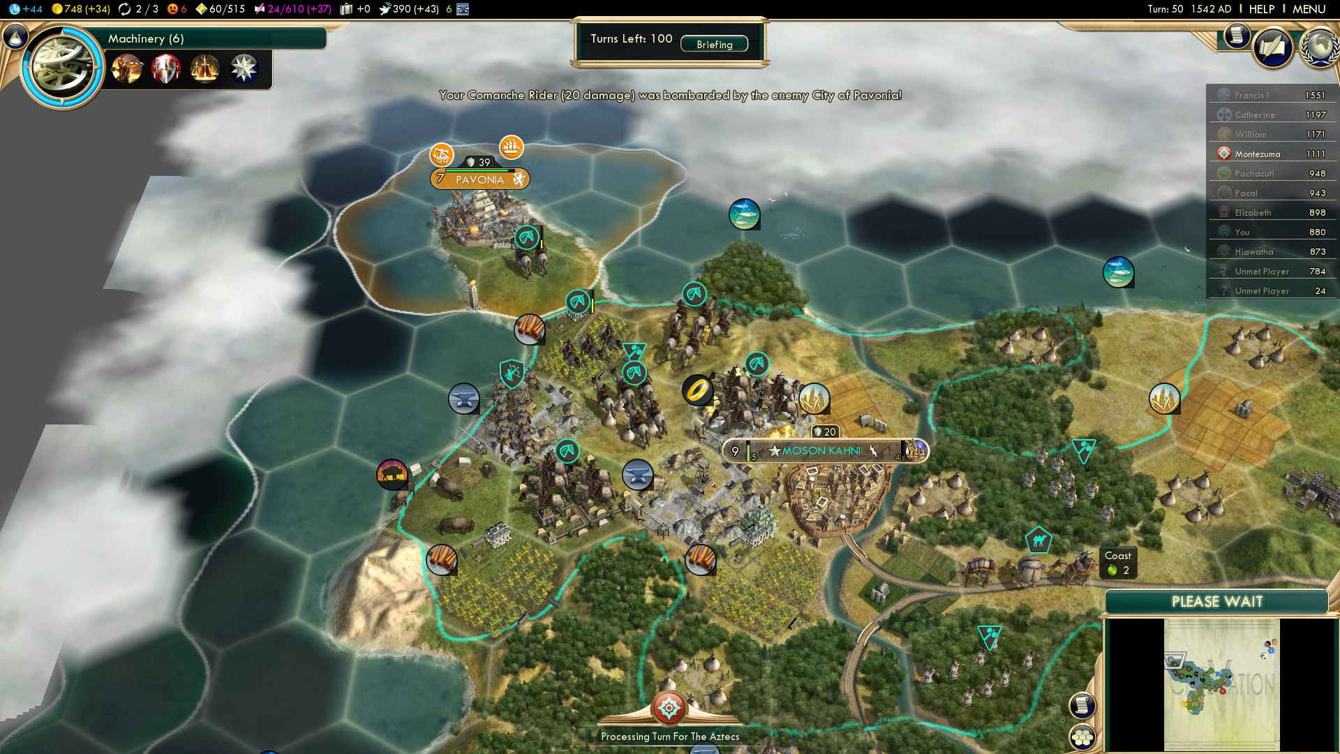 Without their culture boost you’ll get Comanche Riders too late. You’ll need all those valuable Social Policy bonuses for defense, happiness and faith. - Settle as few cities as possible at the coast