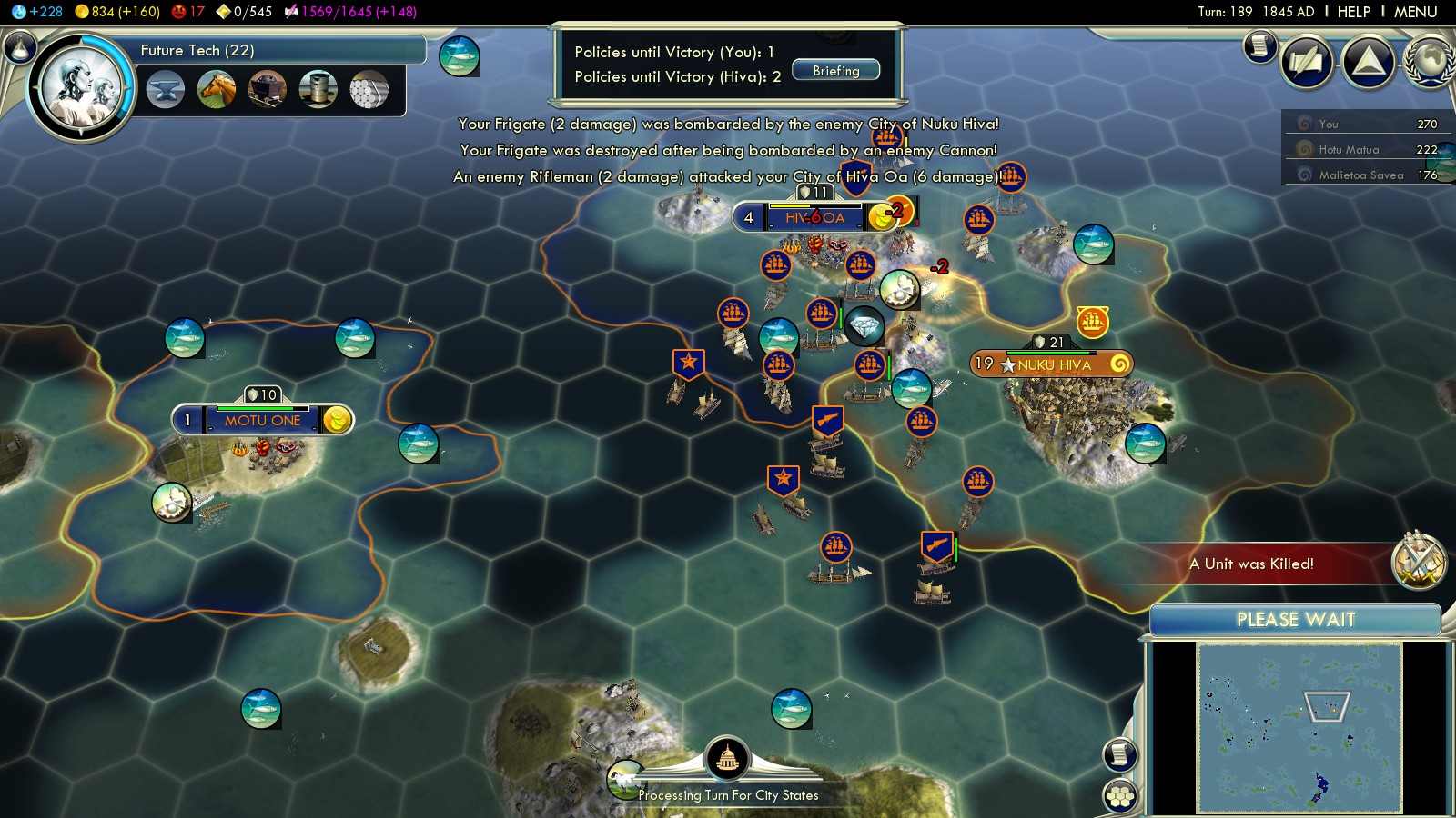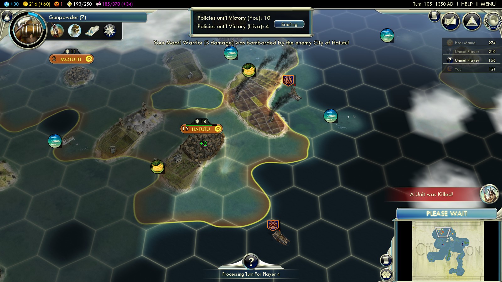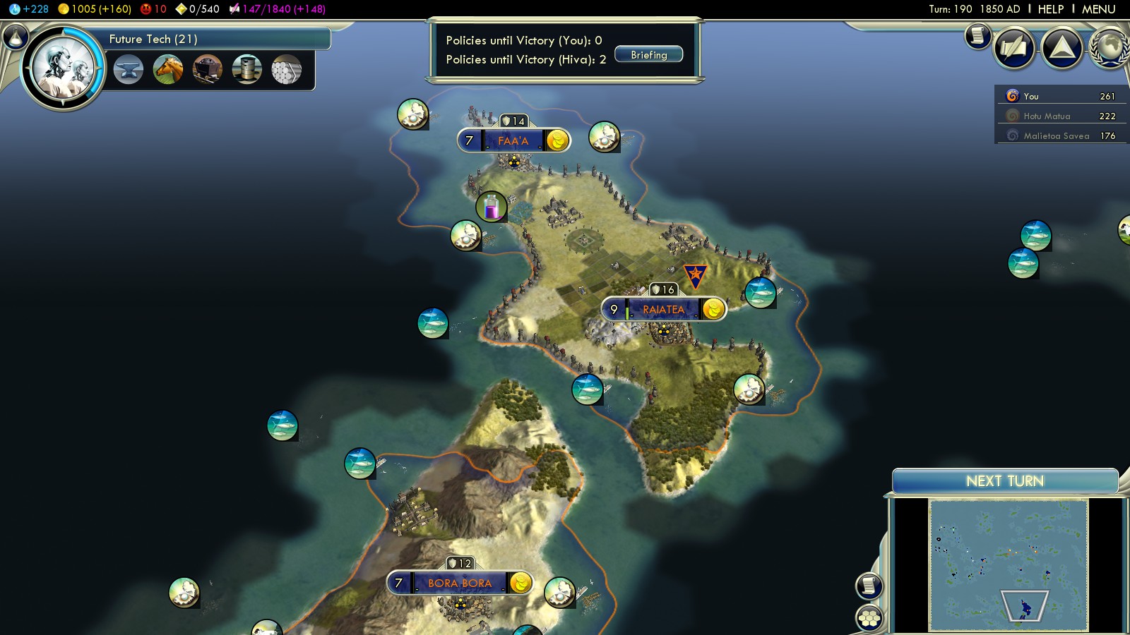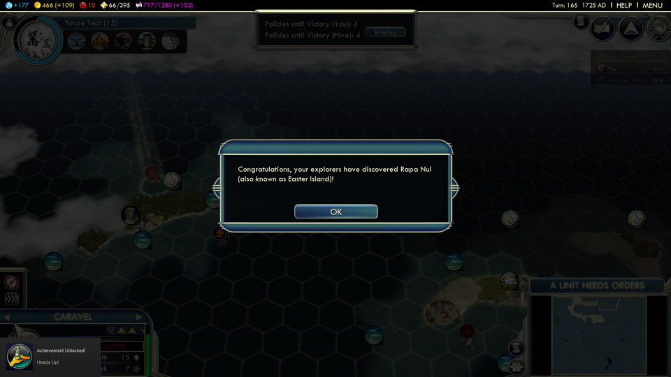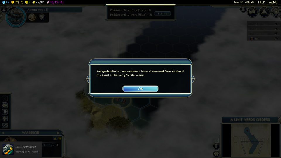 This is what I did in all my games. Playing as Samoa on Immortal the above process started too late. So in the time it took me to build my fleet and sail to attack my enemy No 1 (the one with most social policies adopted) he unlocked the last and won the game. Great news: The achievement triggers regardless! So you don’t even have to win which makes the Steam Achievements for the Paradise Found scenario even more worthless.