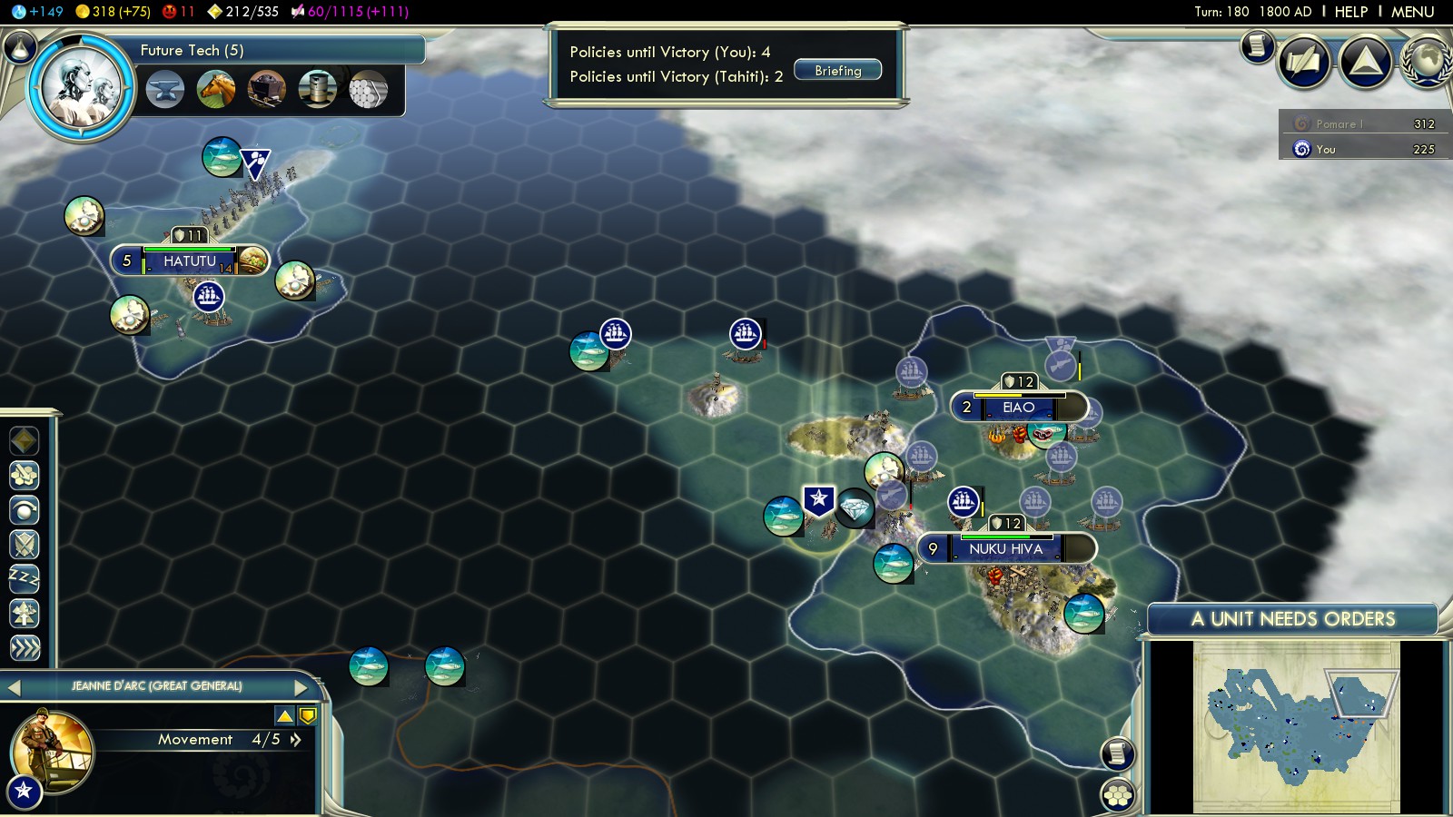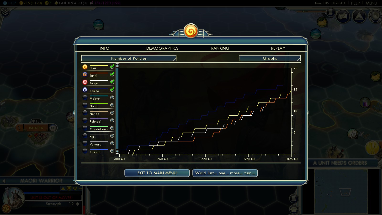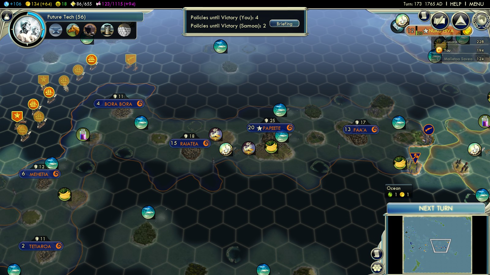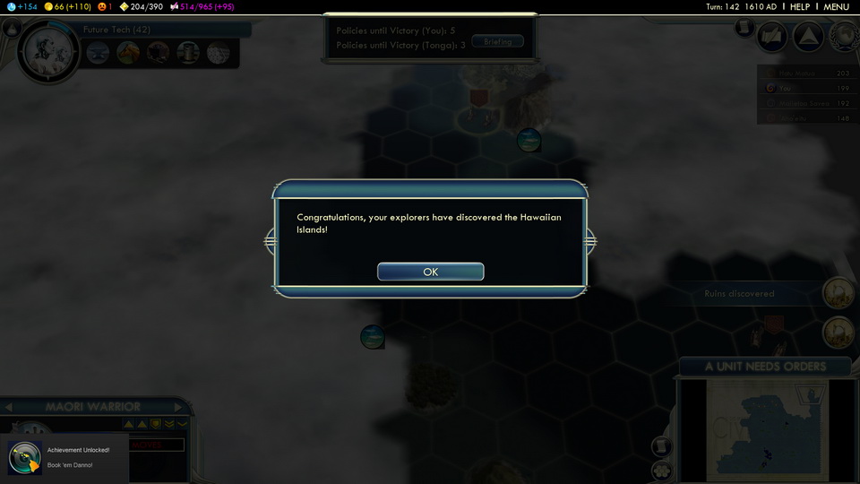 Status: Achieved (Emperor)‘Aho’eitu – Tonga Tiu Tonga Empire: Tonga – 177 islands, population: ~103.000, amazingly Tonga according to Wikipedia has never lost its sovereignty to a foreign power (maybe that’s why Firaxis chose fierce Monty as leader for this scenario) |