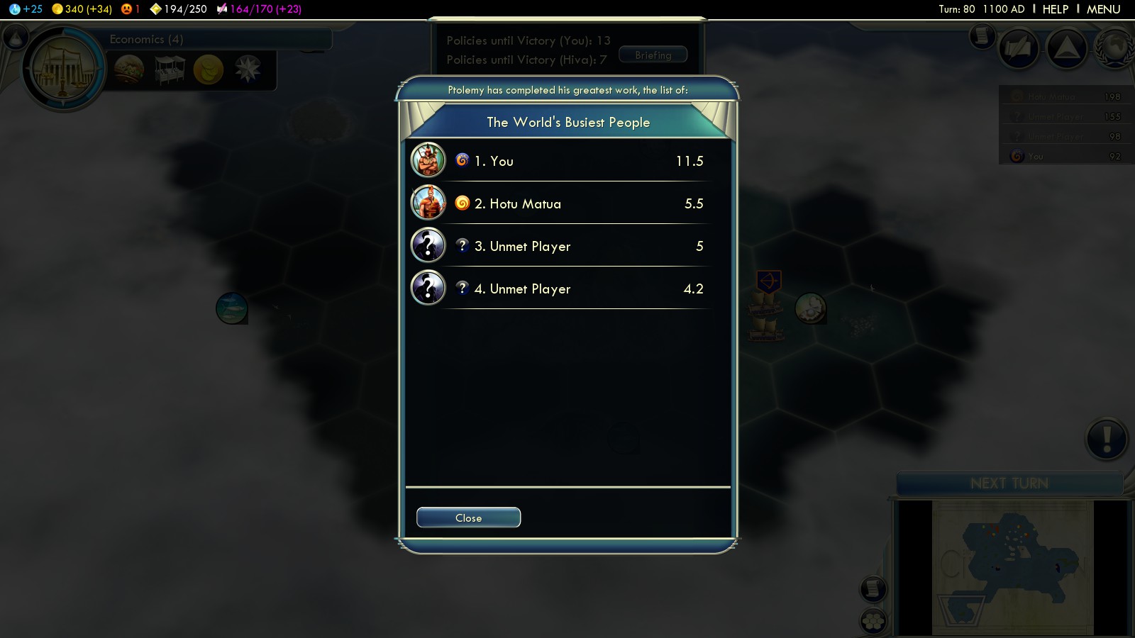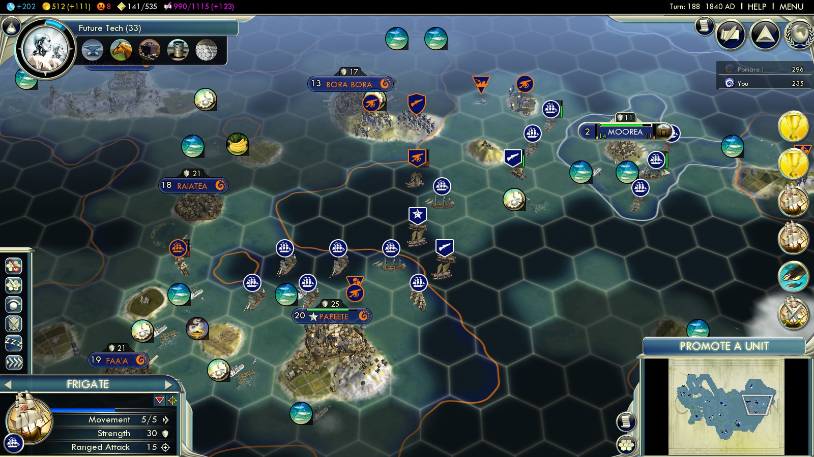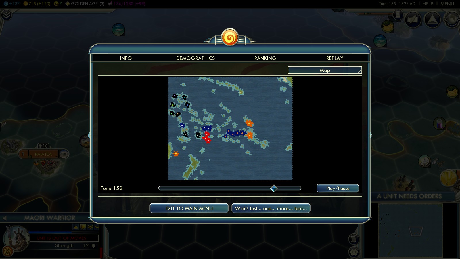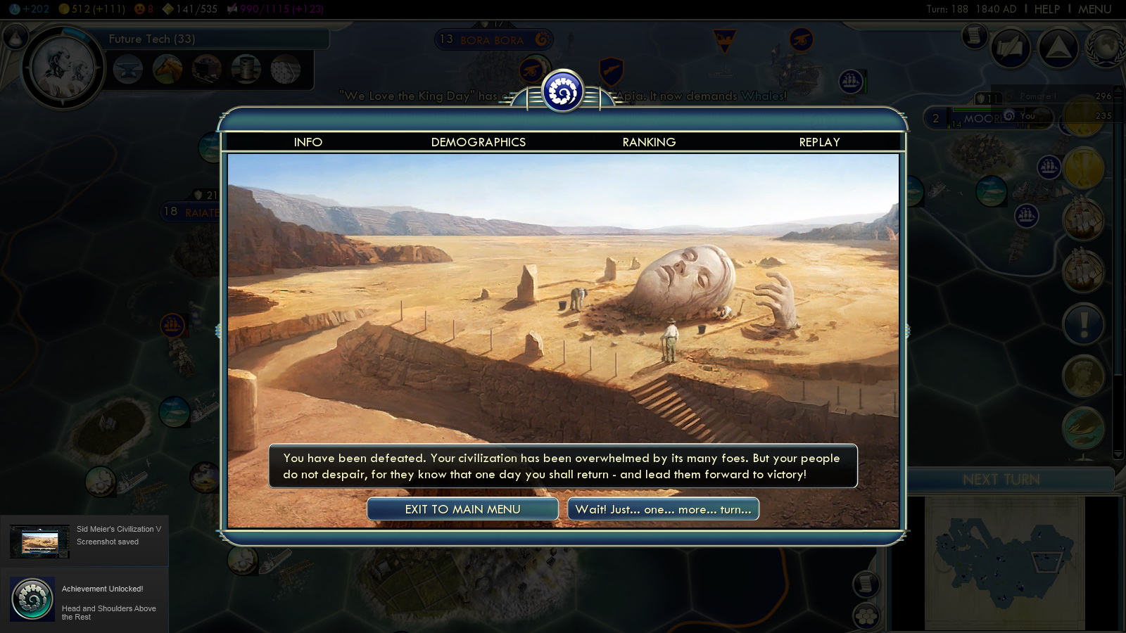 Status: Achieved (Emperor)‘Aho’eitu – Tonga Tiu Tonga Empire: Tonga – 177 islands, population: ~103.000, amazingly Tonga according to Wikipedia has never lost its sovereignty to a foreign power (maybe that’s why Firaxis chose fierce Monty as leader for this scenario) |