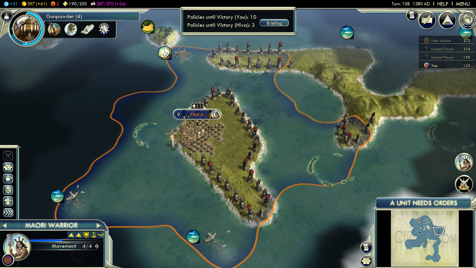 Happiness is a big issue in this scenario. There aren’t many resources around (only those you would typically find in the Pacific Ocean area) and there is NOT ONE SINGLE building that provides local or global happiness. So what I learned in the early games: The fewer cities you have the better. In most games I built 2 cities (capital plus one) which grew to a size of 11 to 12. Not further. I stopped growth once the cities covered all bonus tiles (fish, pearls etc.) and land tiles with Moai statues. Also you should have a specialist work in the cities’ markets and temples.