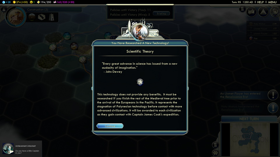 I rather enjoyed the way that this inverted the normal balance of civilization, and forced a different play style: I’ve never tried my hand at going so wide and shallow before, so that was interesting. I was also intrigued by the change of pace: instead of continuous improvement, it was a slow, exploratory and expansionary start, followed by a mad rush after Captain Cooke unlocked new tech.