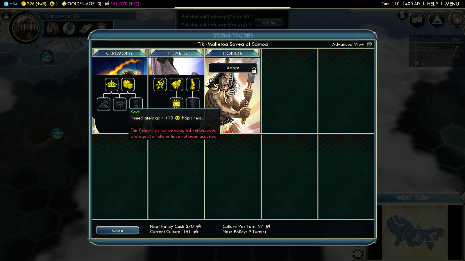 - Kava – Also around this time your capital and 2nd city will have grown to a size that almost uses up all your happiness. So time to invest in Ceremony again.