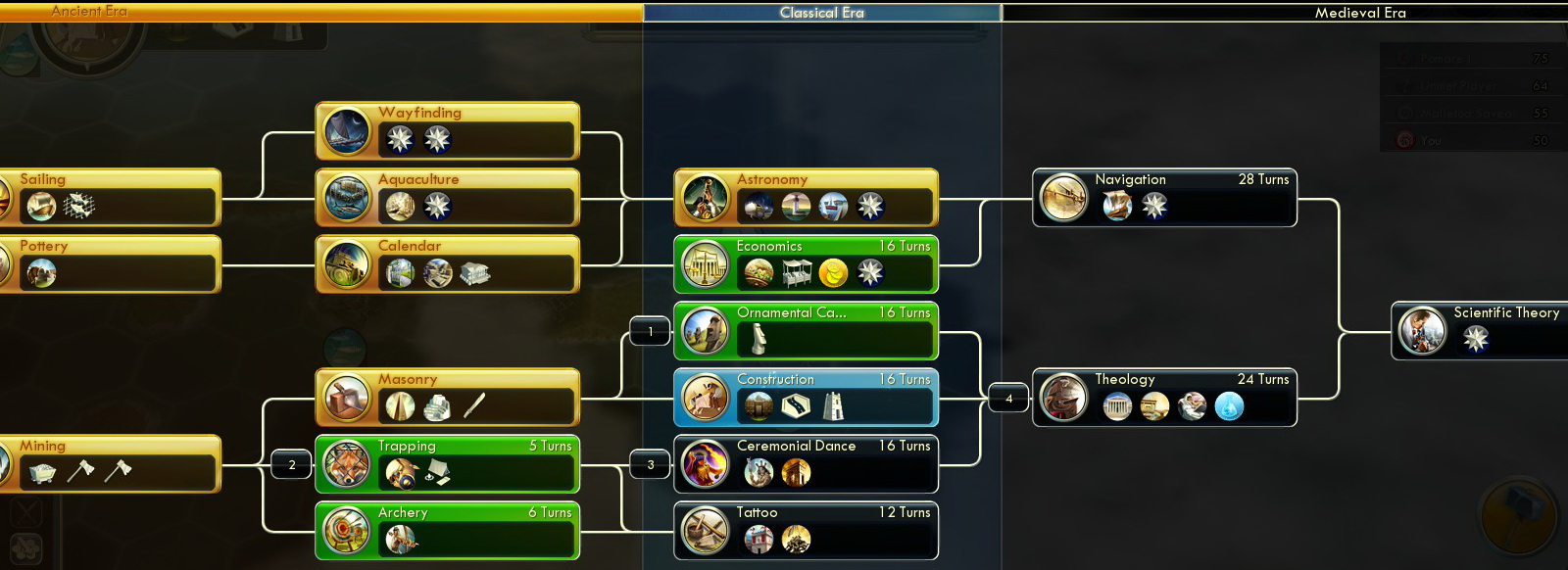 - The Arts – Happiness is not a problem (yet), so time for The Arts, boosting your monument culture output. (Around this time you’ll have the technology to build monuments.)