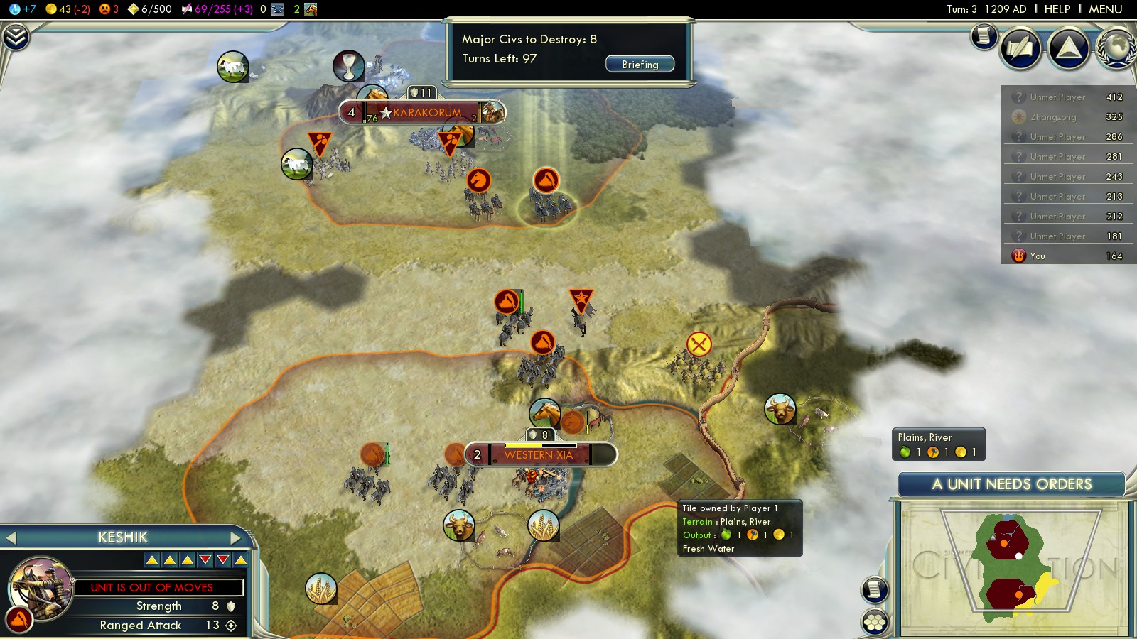 - Turn 34 – using open borders move your most experienced Keshiks past Samarkand into the lowlands between Samarkand and Urgench