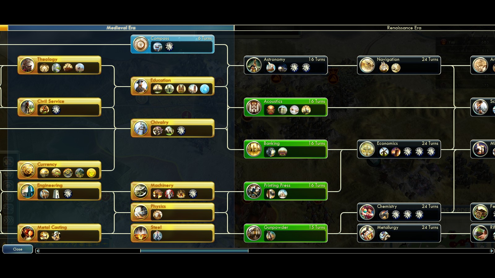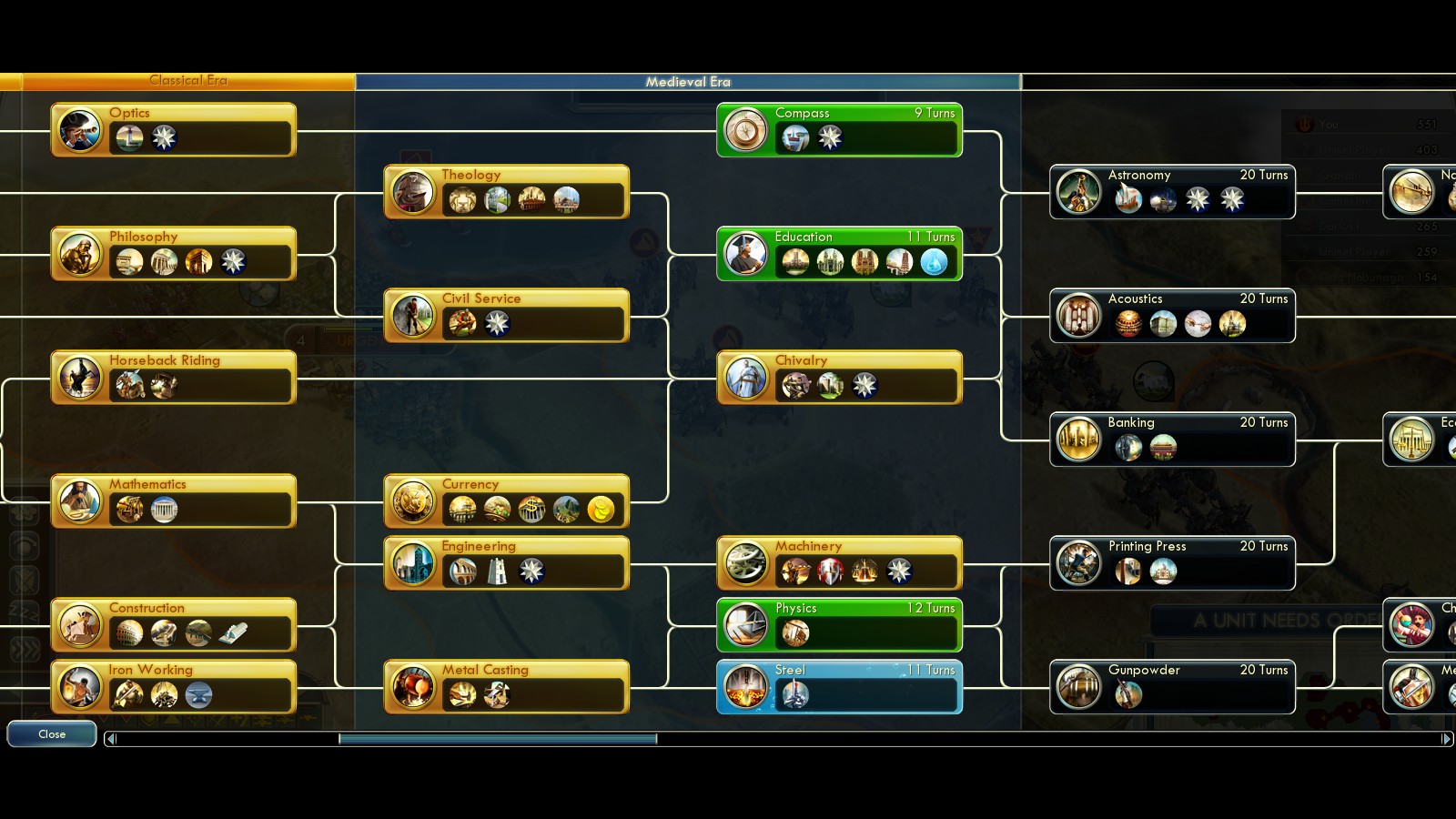 – As for research, I start with construcion. I time my final capture of siam when it ends, so as the free tech i can choose engineering (bridges are very useful in chinas land). Then i go for optics (to capture the small Japanese city, it will be perfectly timed). Then metal casting. Shortly after I finished of China, and did choose machinery, so i got insanely fast road movements on like turn 30. Buying a workshop and a armory in Kakaorum is very useful. After that it isn’t really important what you go for, some AI (in my case byzanz) will build Notre Dame anyway, no way i could’ve gotten it, capturing is easier. You probably can head straight for metallurgy to get a lancer in the lategame, who is more tanky than a horseman, but it’s not that much of a deal.