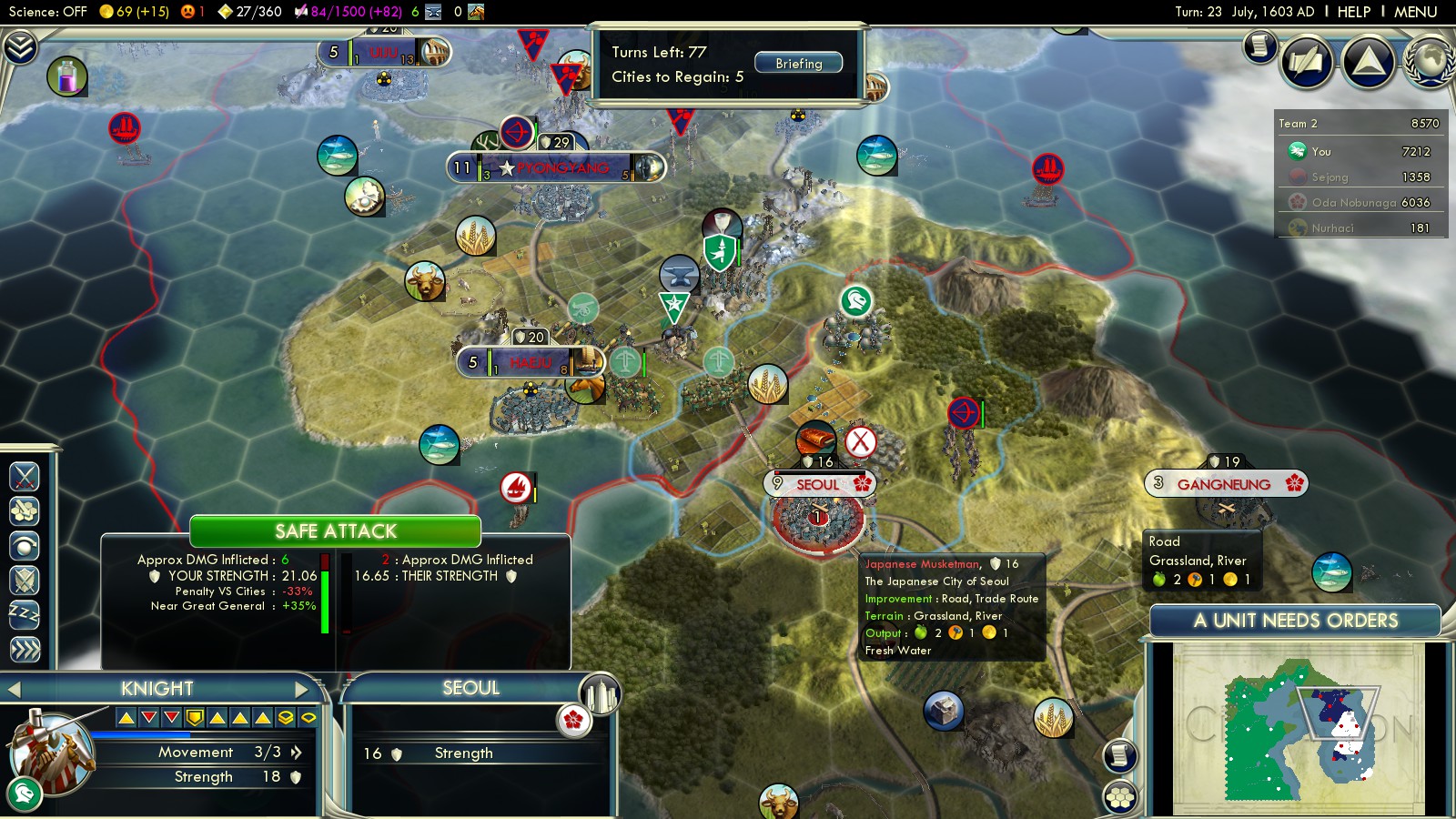 4. I’m a novice player, so playing on deity is a bit intimidating- I found it incredibly easy to win as Korea on Immortal simply by spamming boats from the northern Korean cities, sending them south of the Korean peninsula, and instantly destroying embarked Japanese units– cheese, but an effective way of cutting off all but the Wajo reinforcements, and letting me build up units in Seoul to push and reclaim the rest of Korea by around turn 70. Your guides are fantastic, thank you so much!