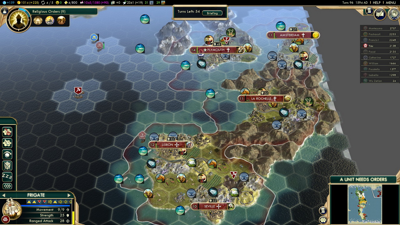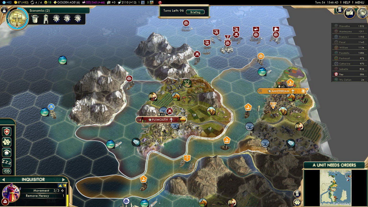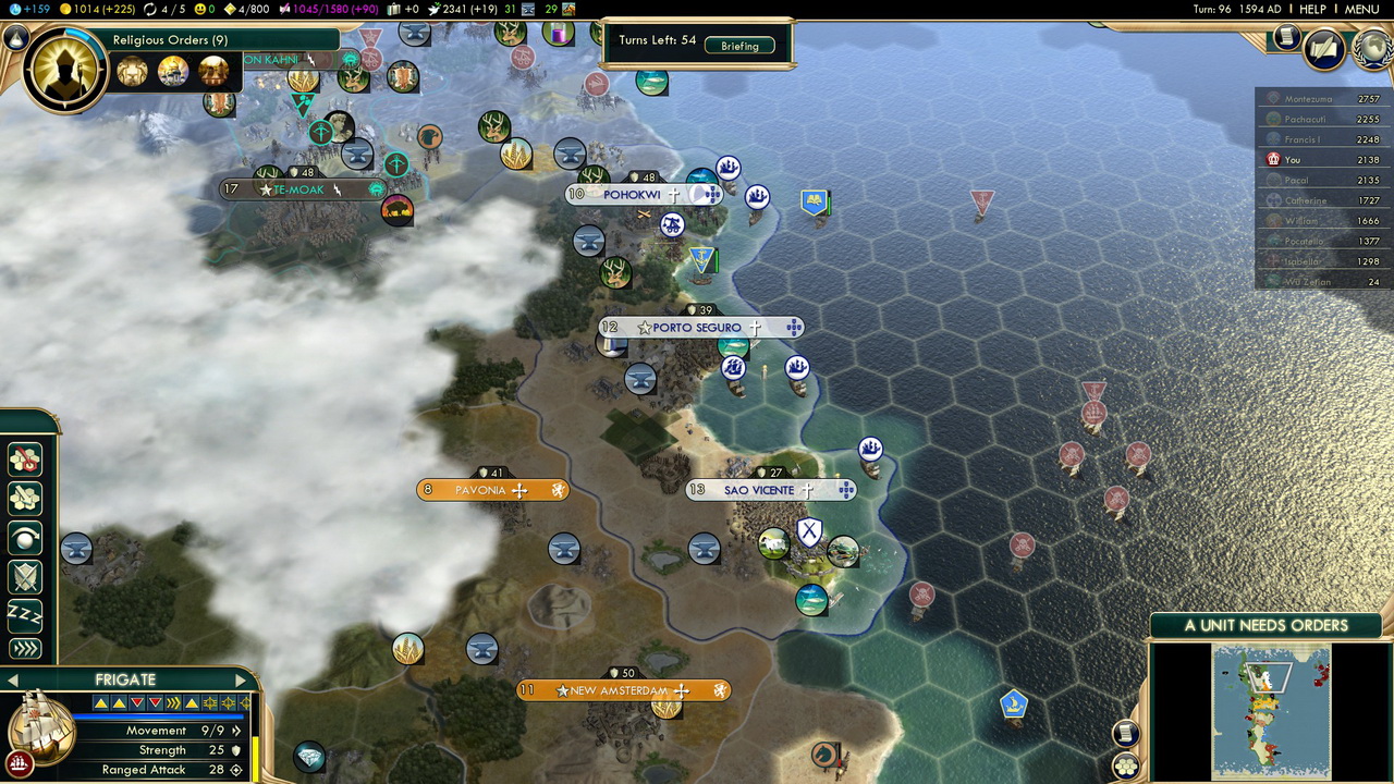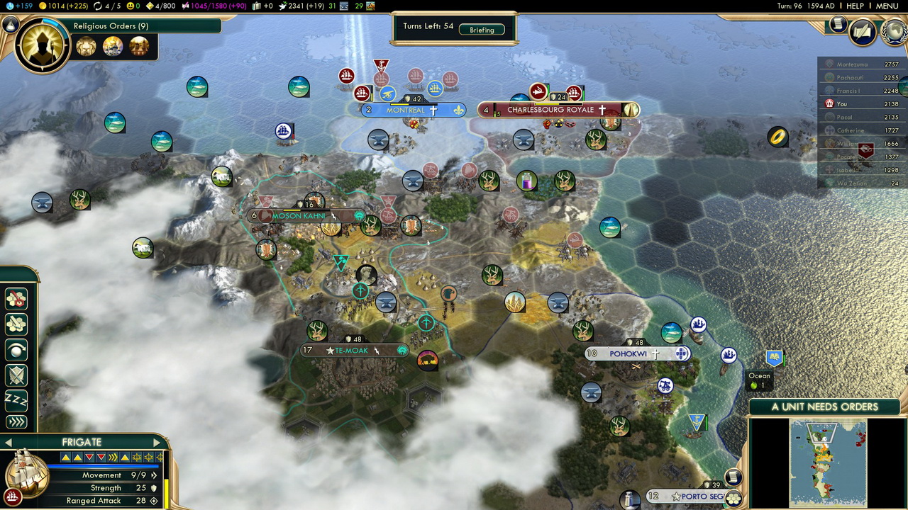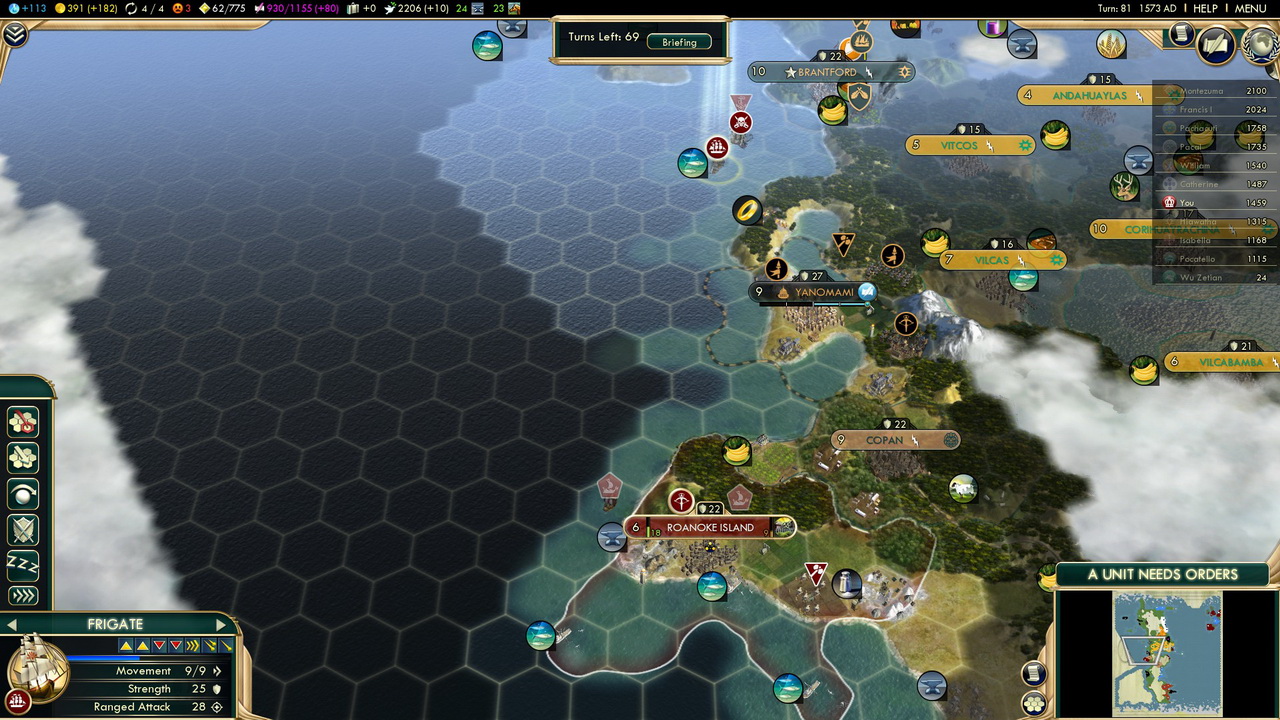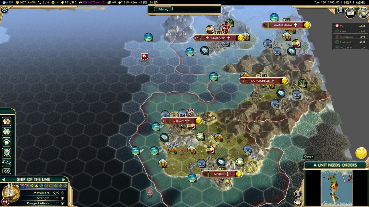 So in 30 turns the European nations lost their home base. This bereft them of the option of intercontinental trade routes, heavily cutting their Gold per turn income.