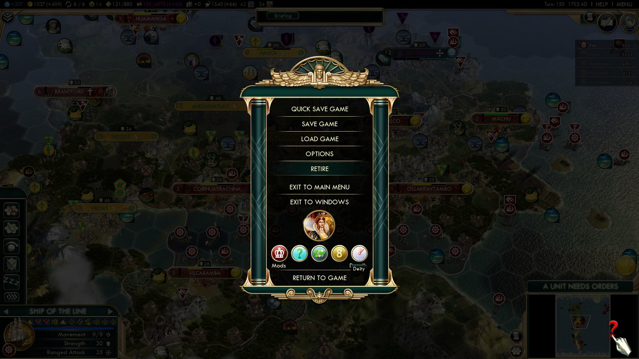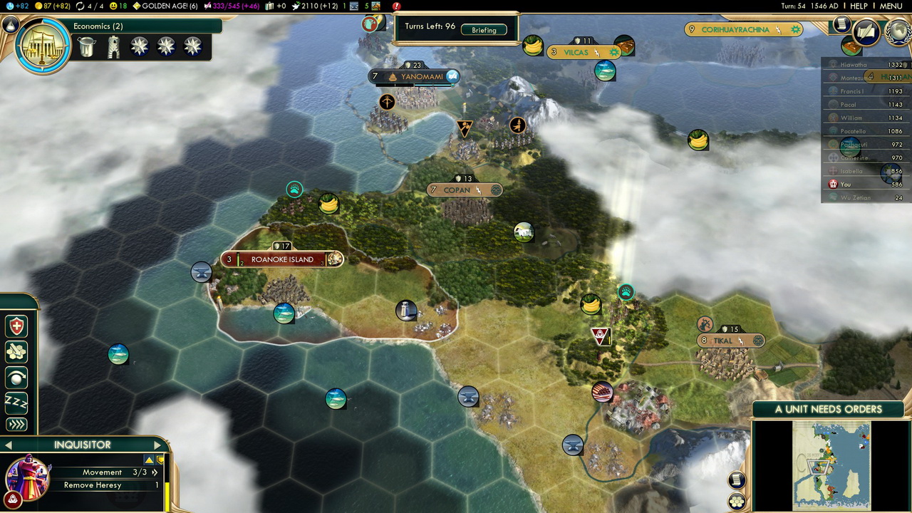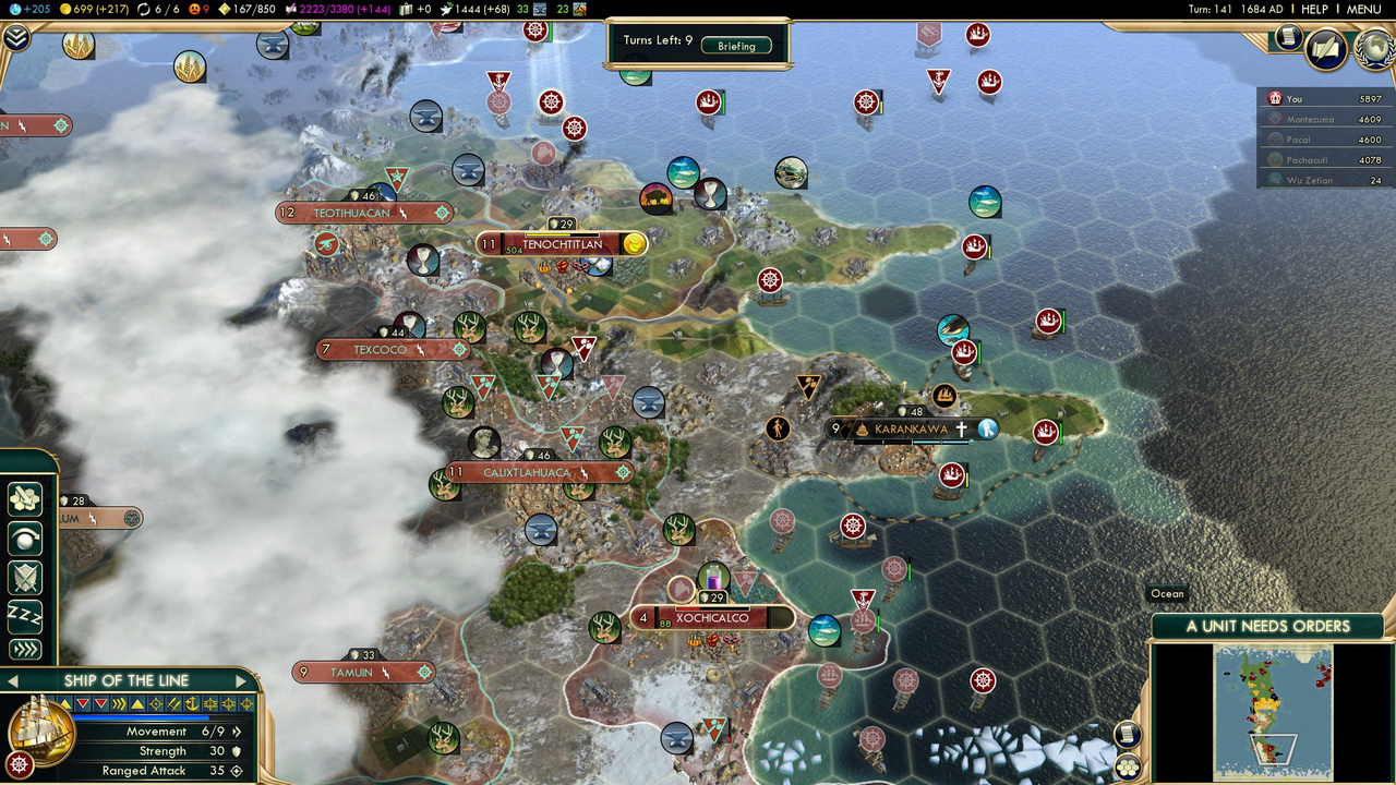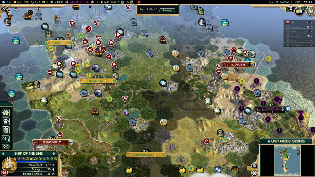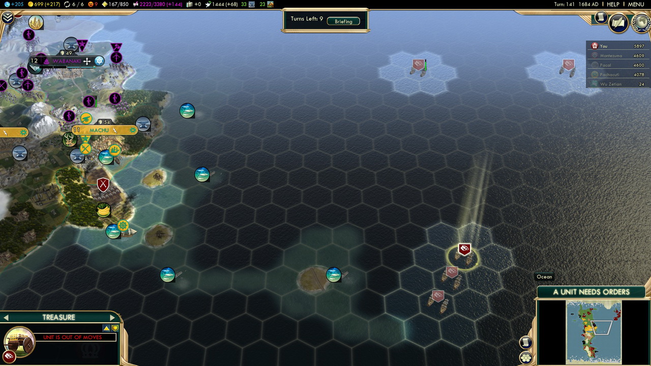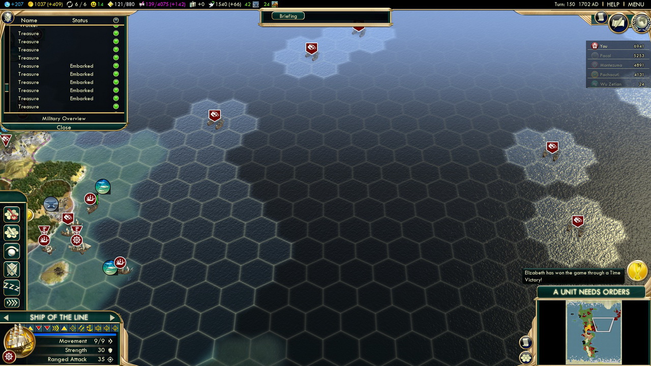 So in 30 turns the European nations lost their home base. This bereft them of the option of intercontinental trade routes, heavily cutting their Gold per turn income.