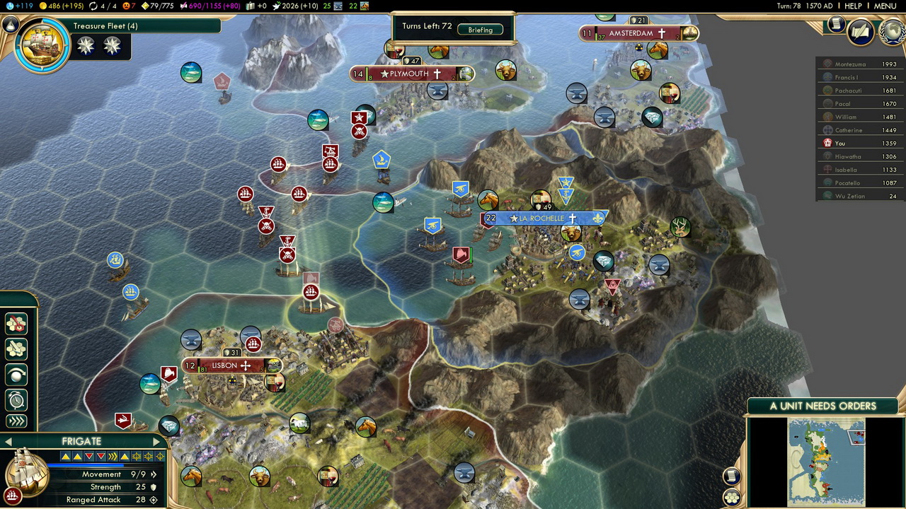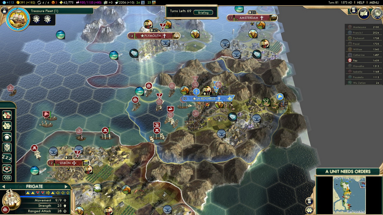 Sadly the Happiness rating said -15 🙁 after capturing La Rochelle. But Happiness can be managed through buildings, trade and Social Policies.