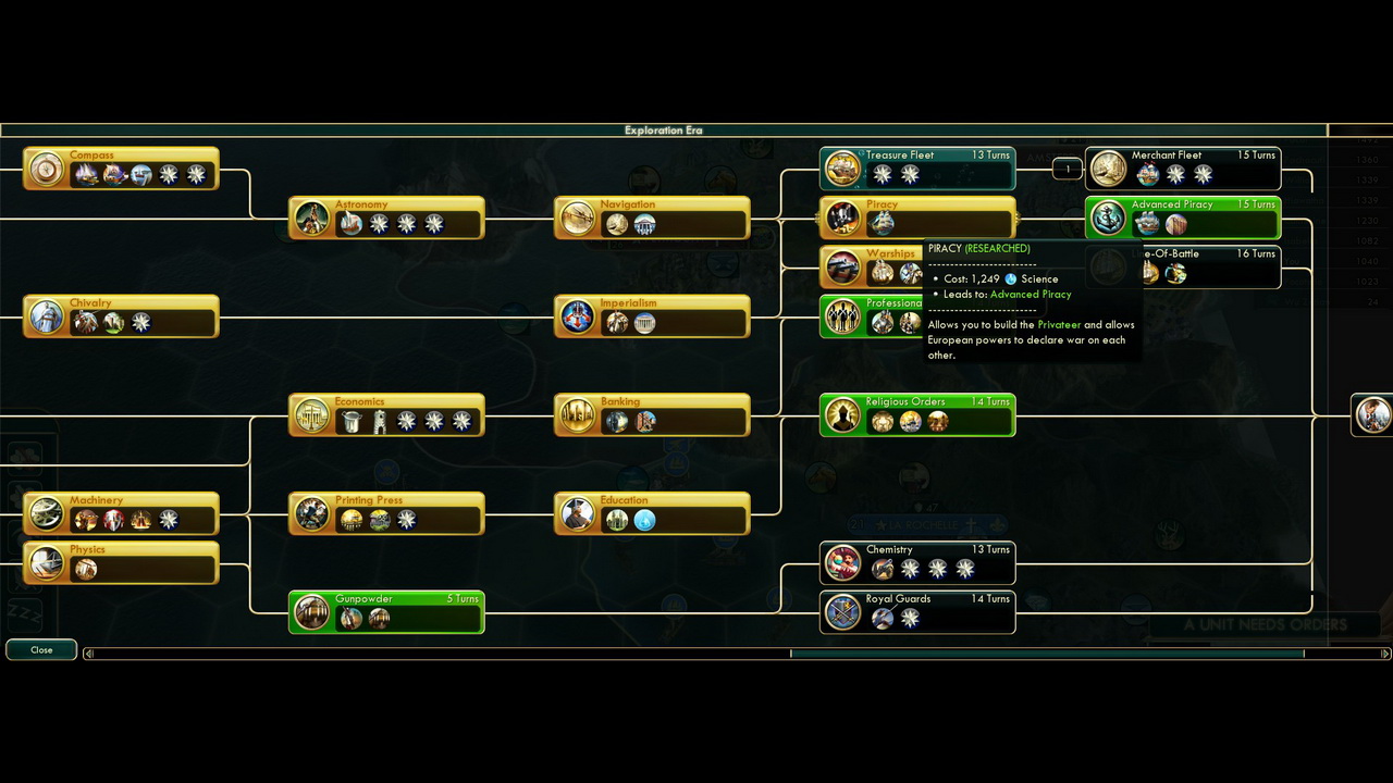 All research is directed at reaching Piracy as soon as possible. More details on Research will be provided with future Conquest of the New World Strategy Guides.