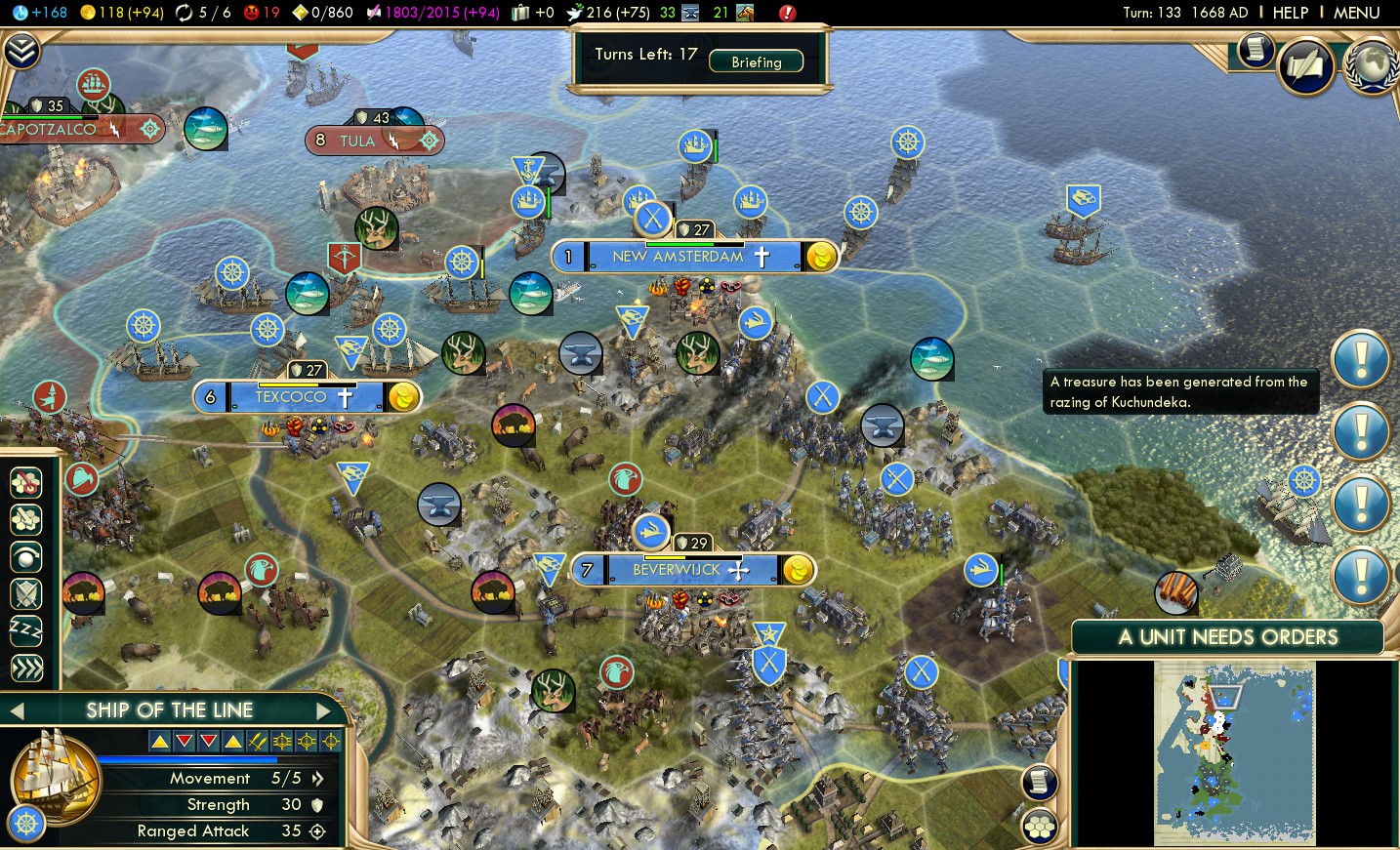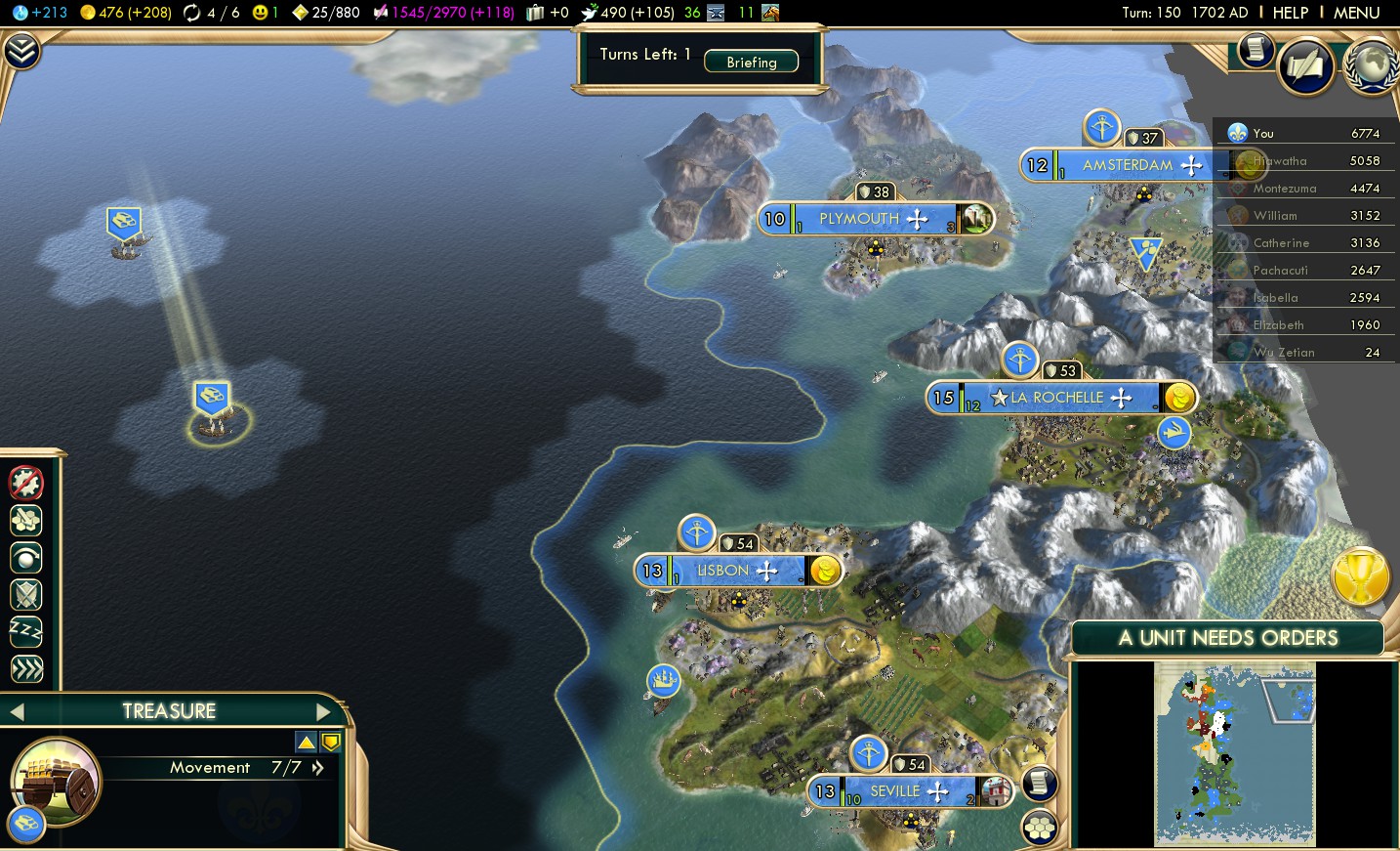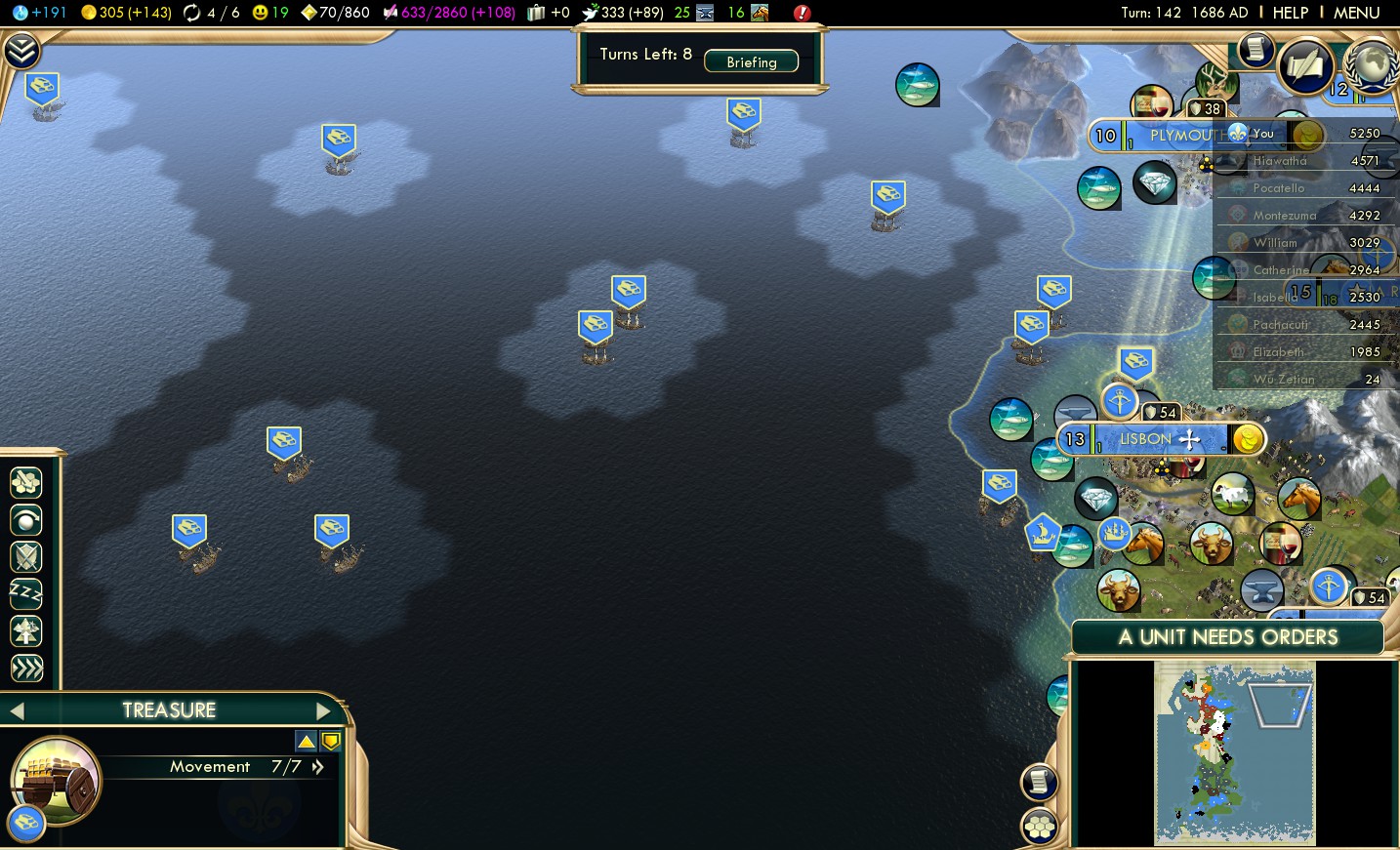 Playing France, Europe was liberated 6 turns earlier than playing England even though their ships have an additional +2 movement points. The point of all this — again — is to make the other European nations lose their home base. Without intercontinental trade routes their Gold per turn income is heavily cut.