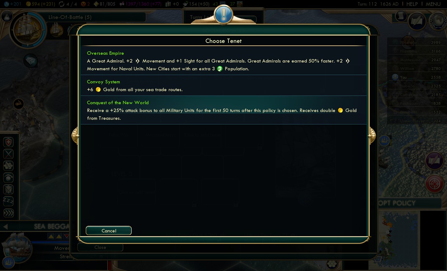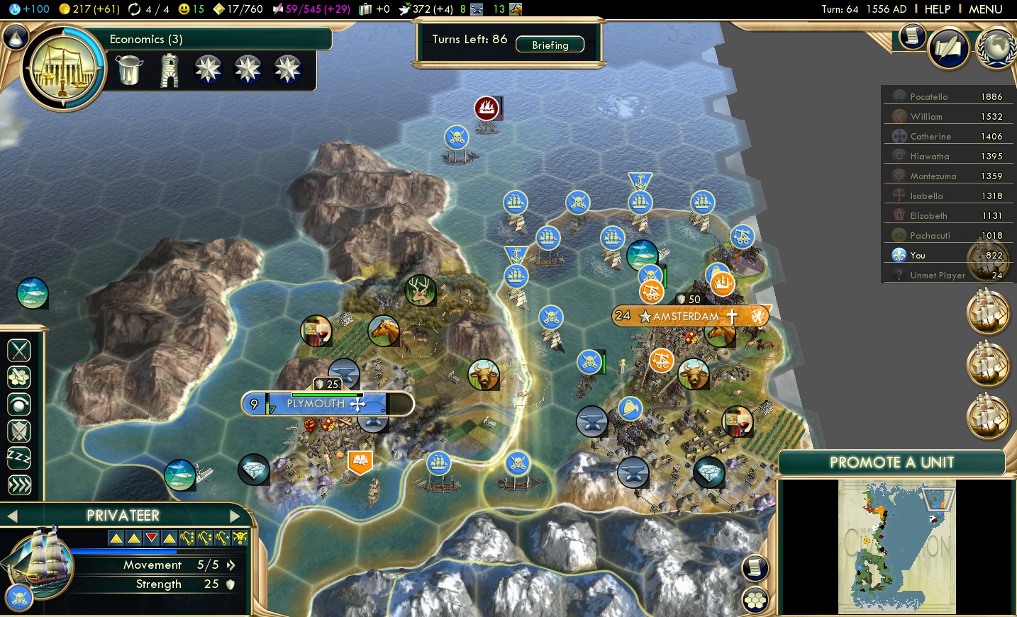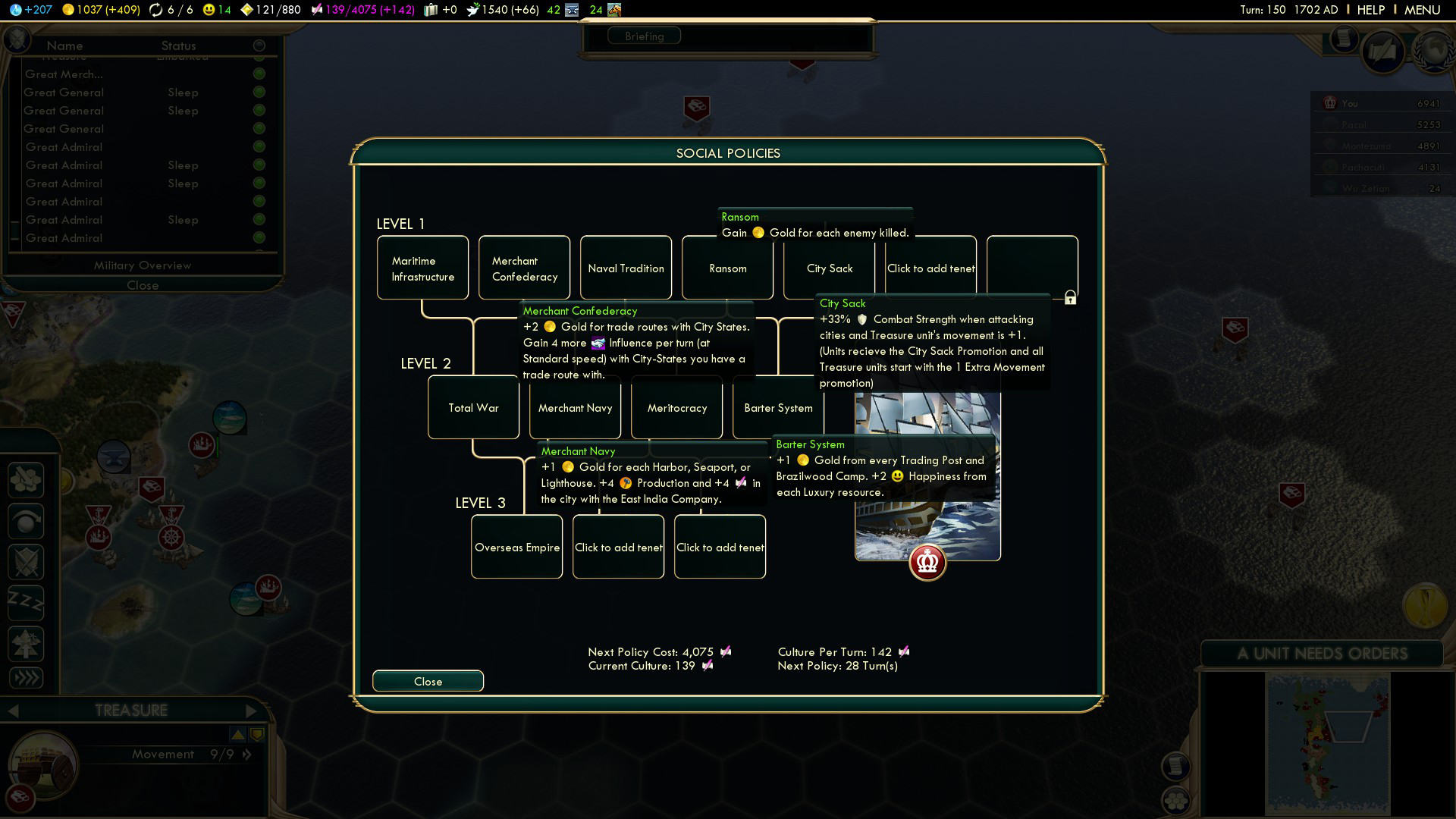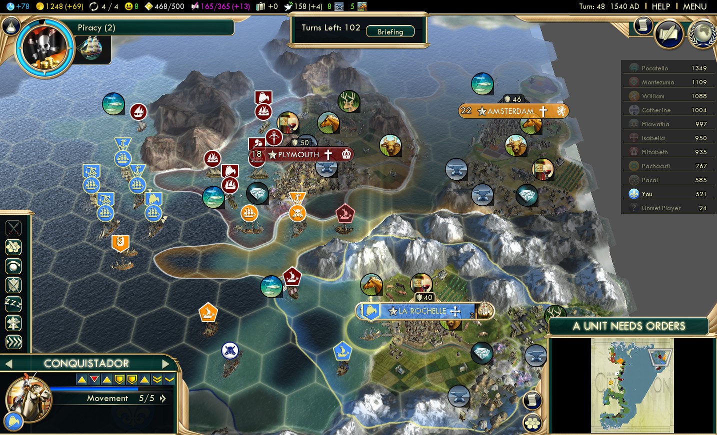 Playing France, Europe was liberated 6 turns earlier than playing England even though their ships have an additional +2 movement points. The point of all this — again — is to make the other European nations lose their home base. Without intercontinental trade routes their Gold per turn income is heavily cut.
