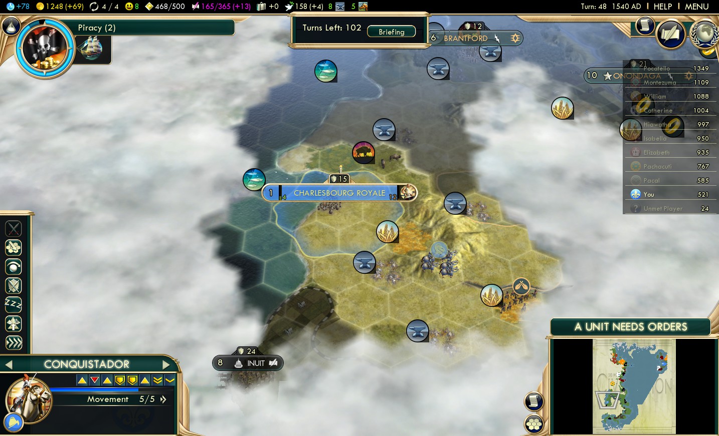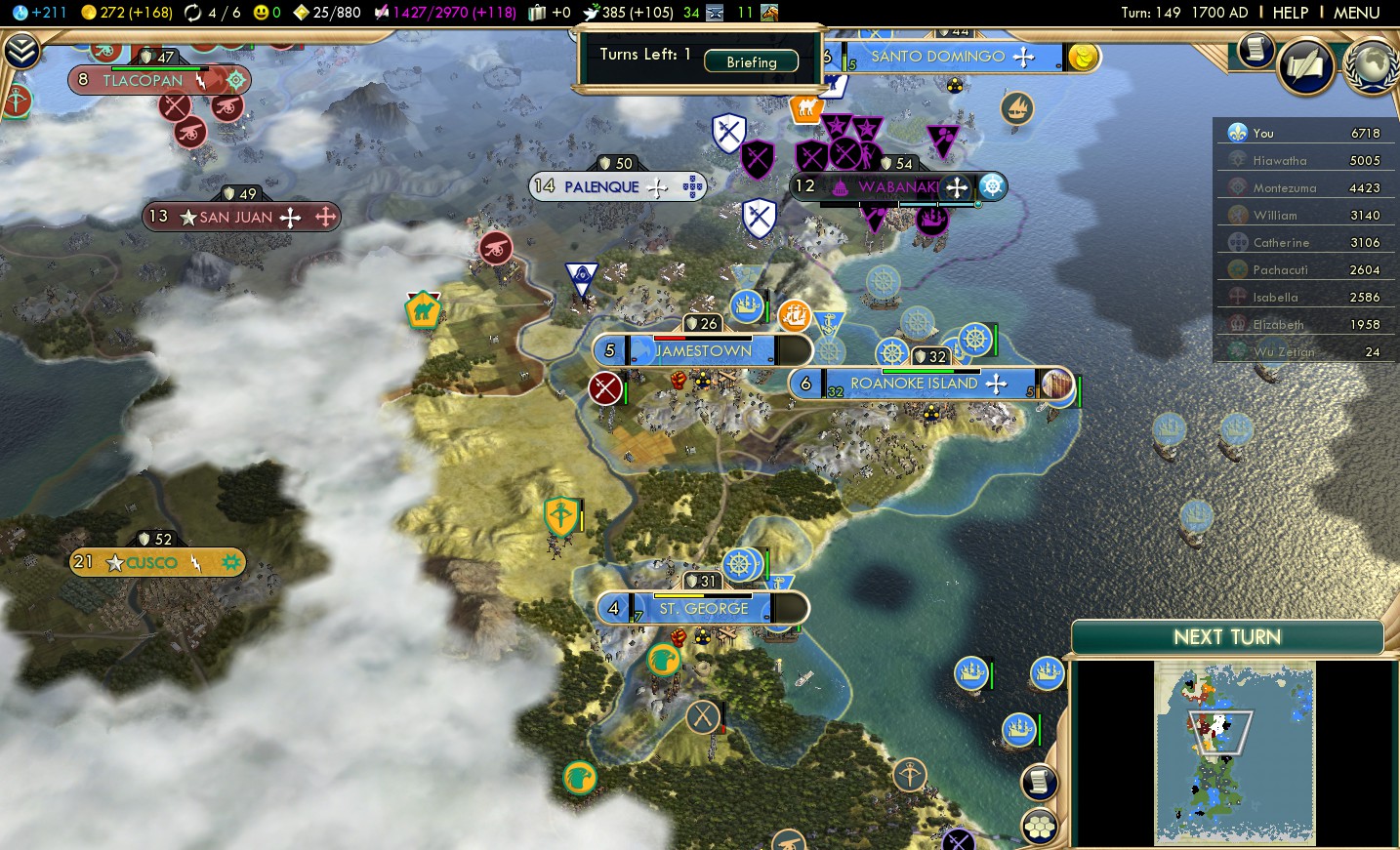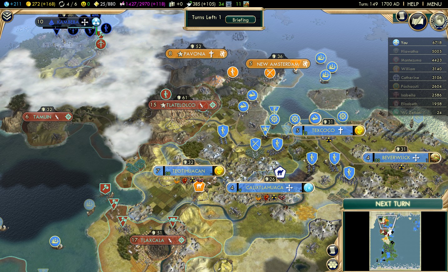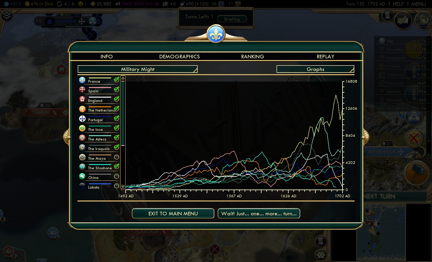 Since the Europeans are still much more powerful than the Native Americans, the first goal still is to get rid of them or at least severely diminish them. The following is the chronology of conquest in the Americas. Unfortunately unlike in my England Deity game I wasn’t able to completely destroy any of the European Nations: