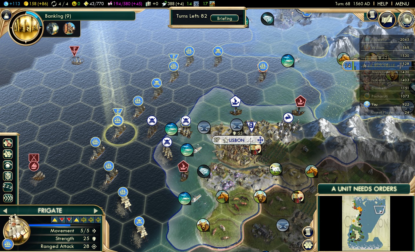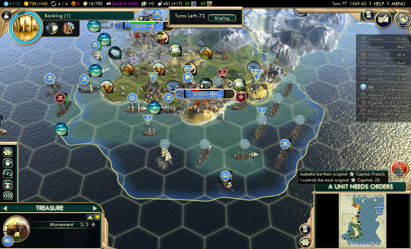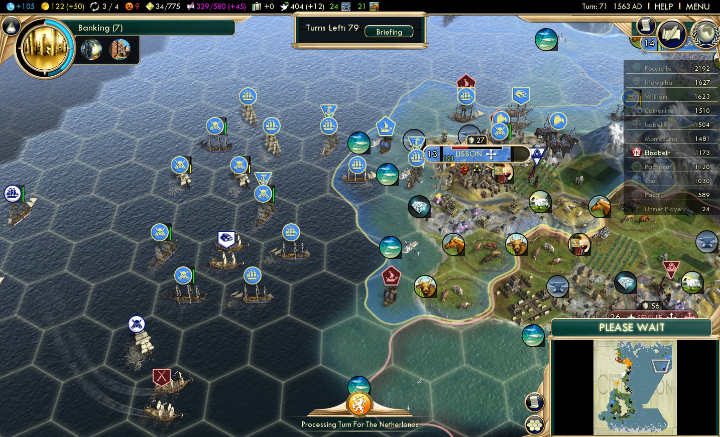 Bringing the (now even bigger) fleet in position at Seville and having the ground troops attack from land, Spain was the last nut to crack. The AI really notices my warmongering and arms quite a lot. Declaring war in turn 75, my fleet captured Seville in turn 77 (they were really mad – we only made peace in turn 99).