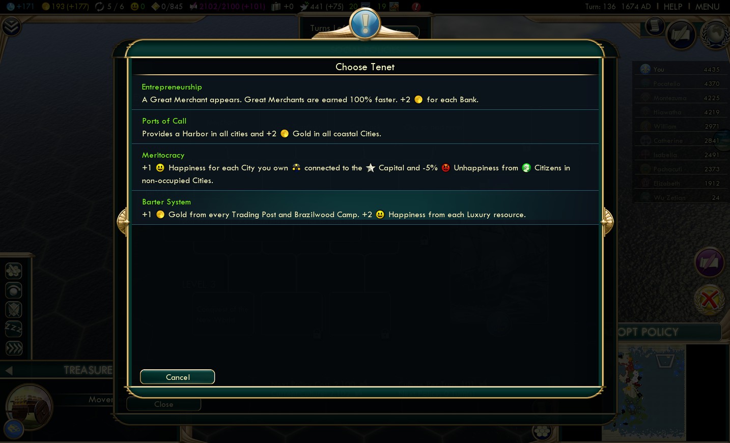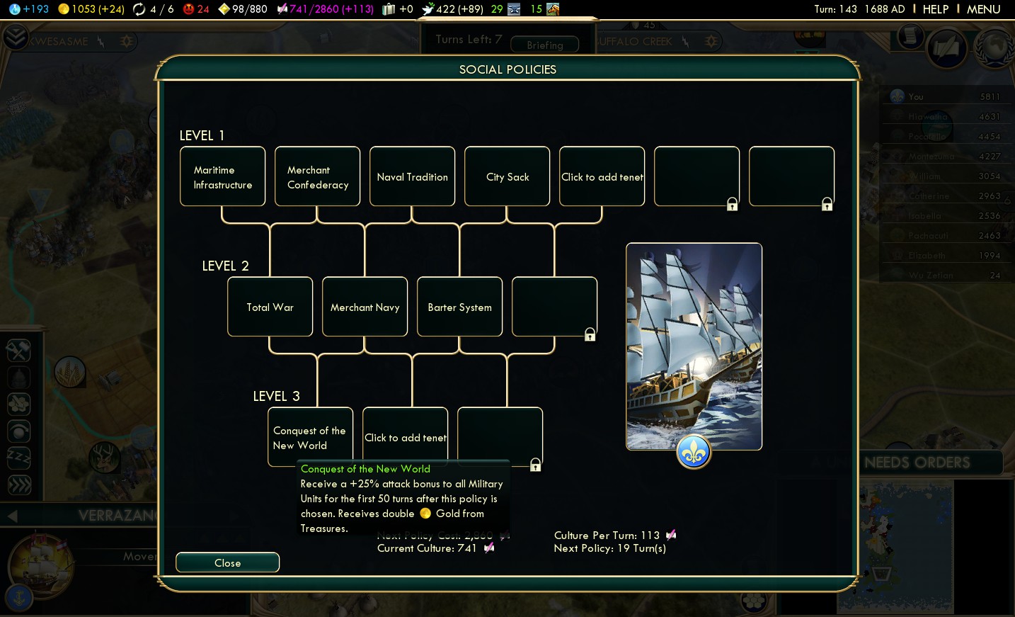 Here a quick overall of the all the social policies available in the Conquest of the New World Scenario:
