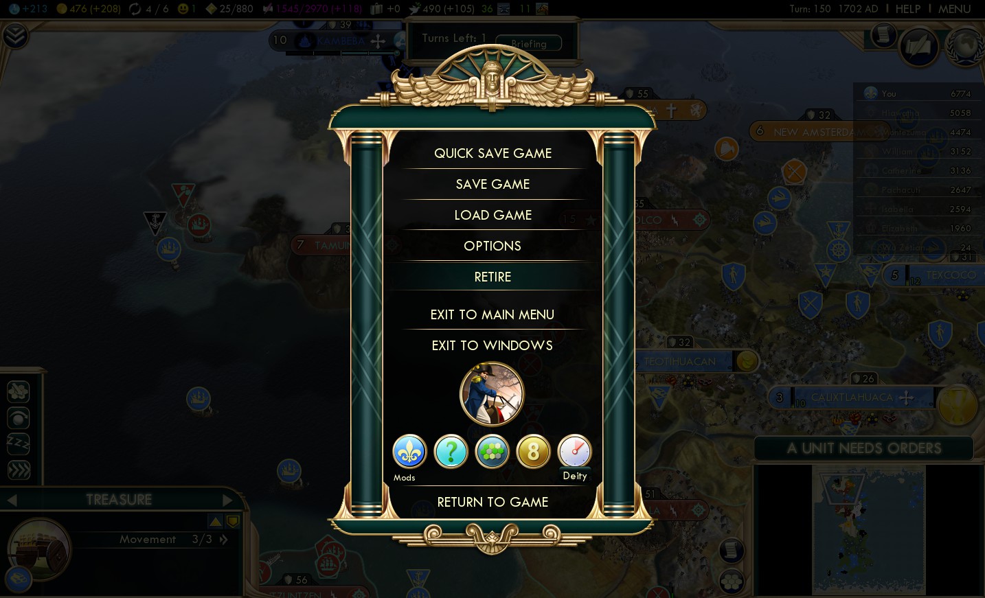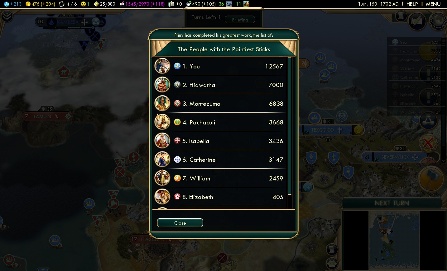 Hey, I just want to let people know that playing peaceful with the Europeans is totally viable way to win on Deity, in fact I think it’s the best way to get a top score.