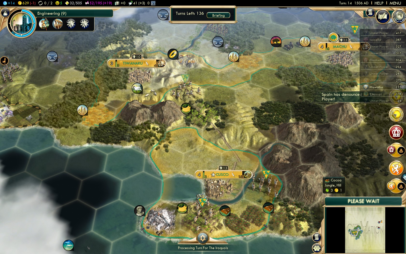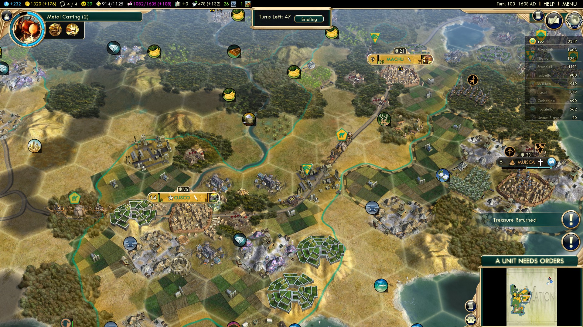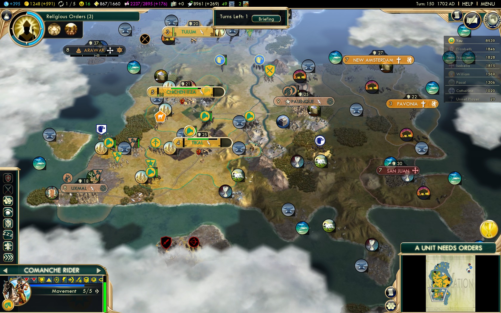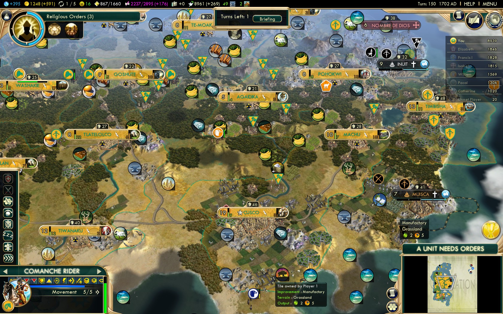 From here on this guide follows the best practices of all Native American civilizations. Of course on this level the strategies that work on Deity make for overwhelming dominance on Settler!