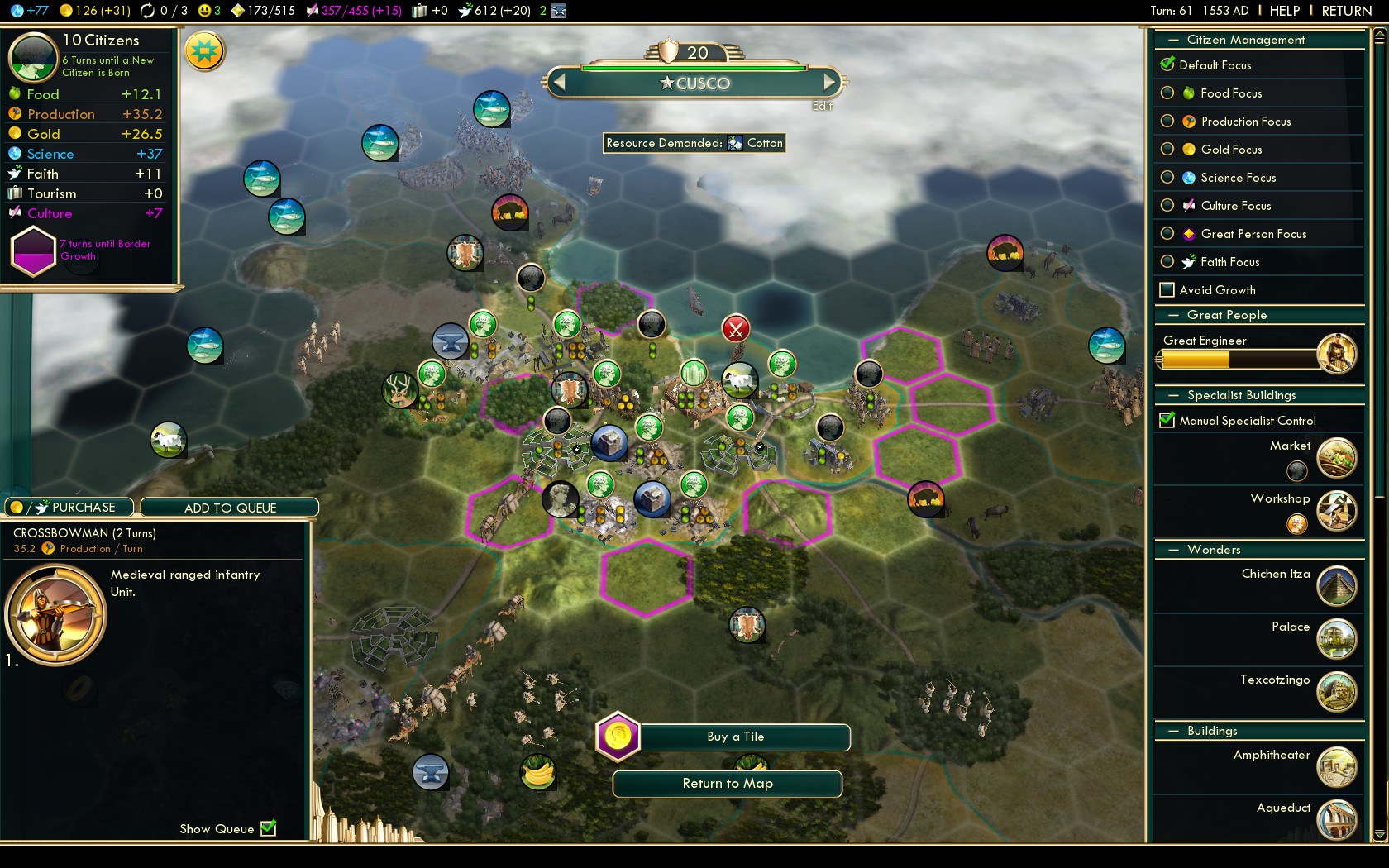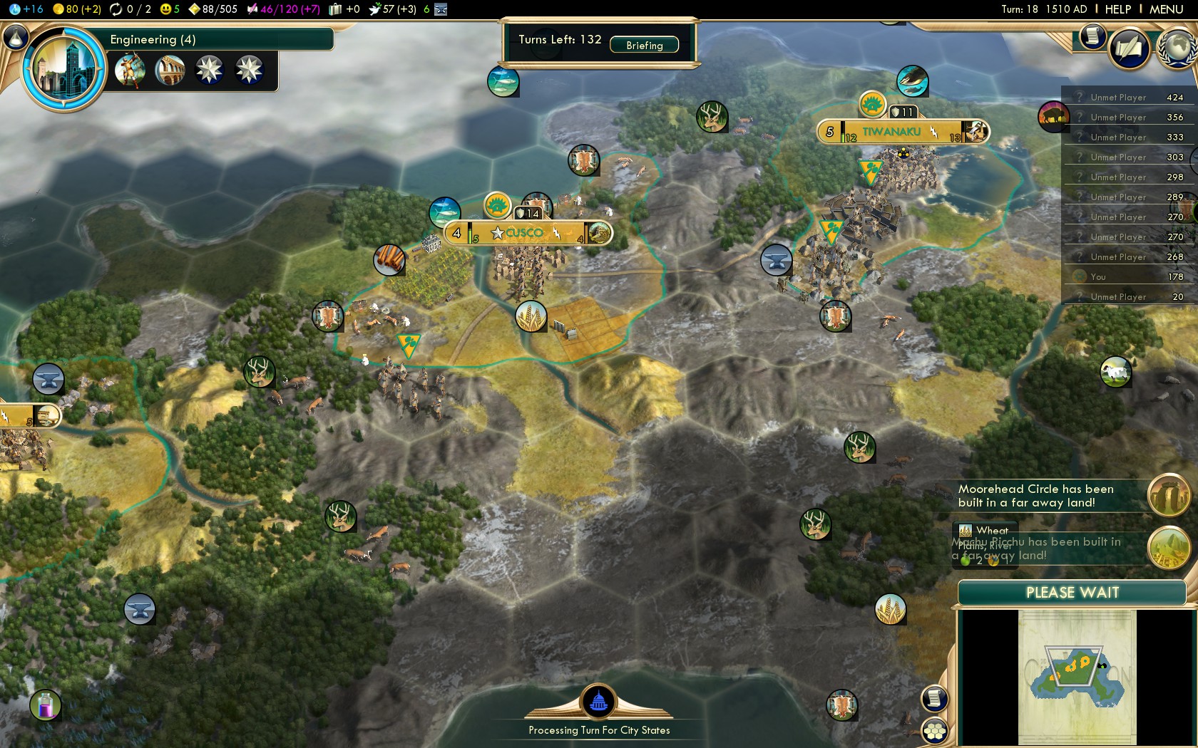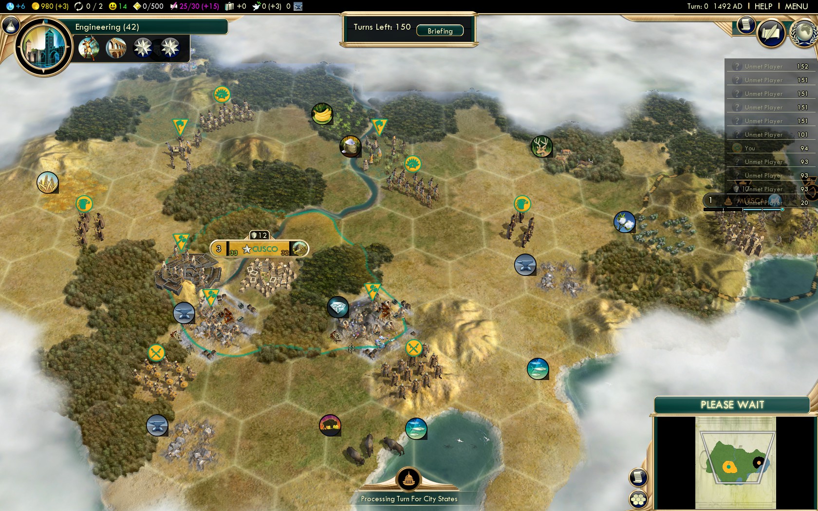 In my attempt to win on Deity difficulty with the Incas I started hundreds of games. 55 games had a decent starting position so I’ve played at least some turns (something between 5 and 15) to find out whether there’s sufficient strategic resources and luxuries in the vicinity for a decent game. The main thing however is the search for cultural city states.