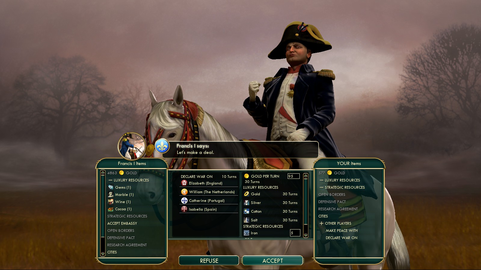 Always bribe as many Europeans against one another as possible. I set France against everyone. Later even England and Spain could be bribe against all others. Unfortunately convincing William of Orange of the Netherlands to wage war was not always possible. Thus unfortunately he kept his scoring momentum and stayed ahead of me. See: It’s vital to keep Europeans warring each other!
