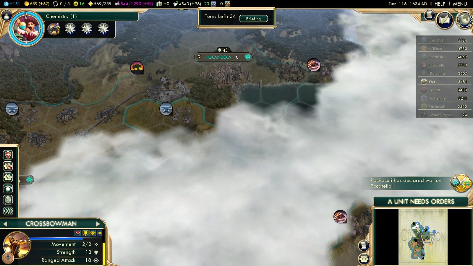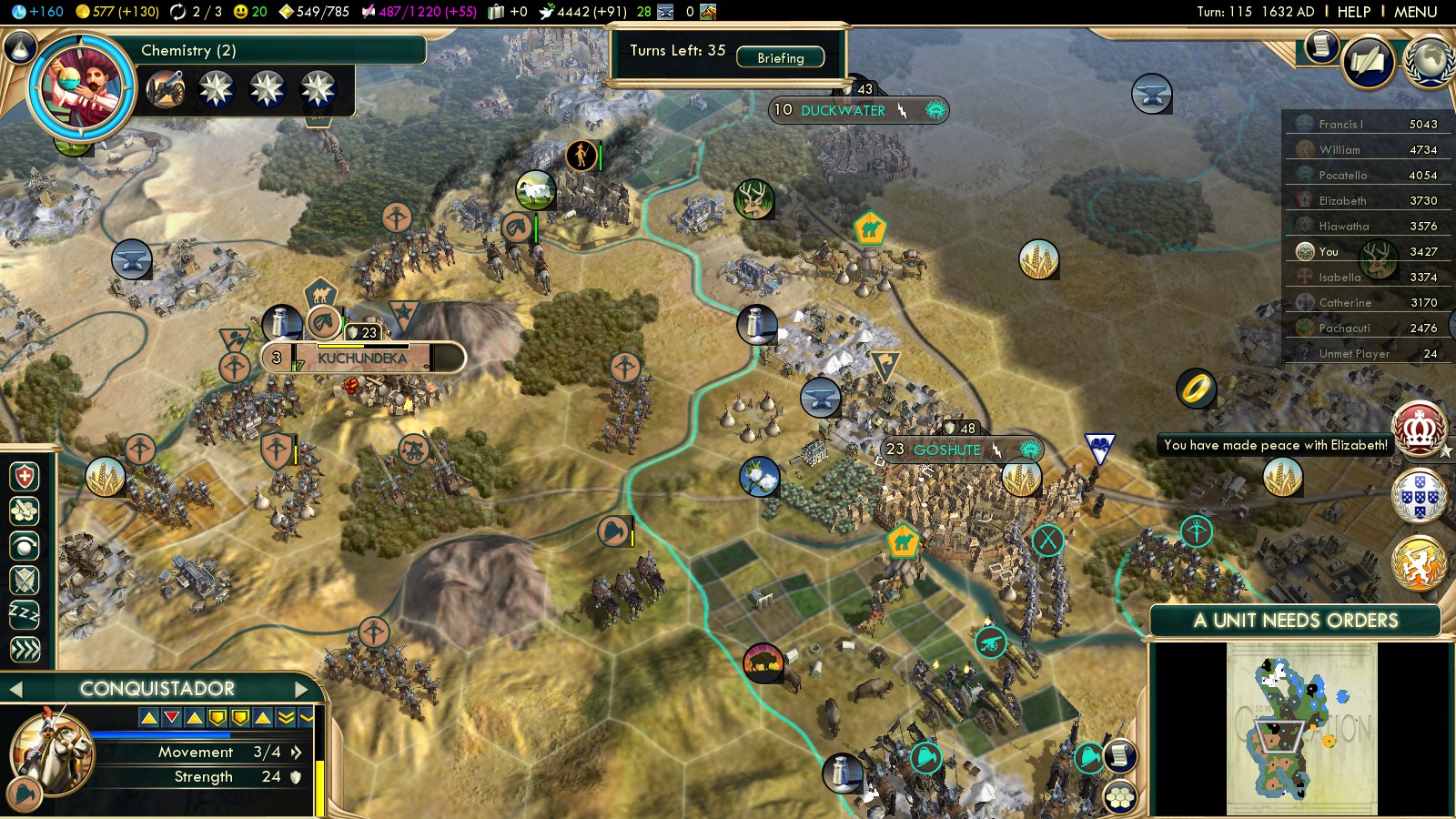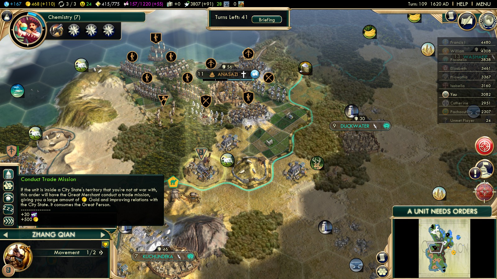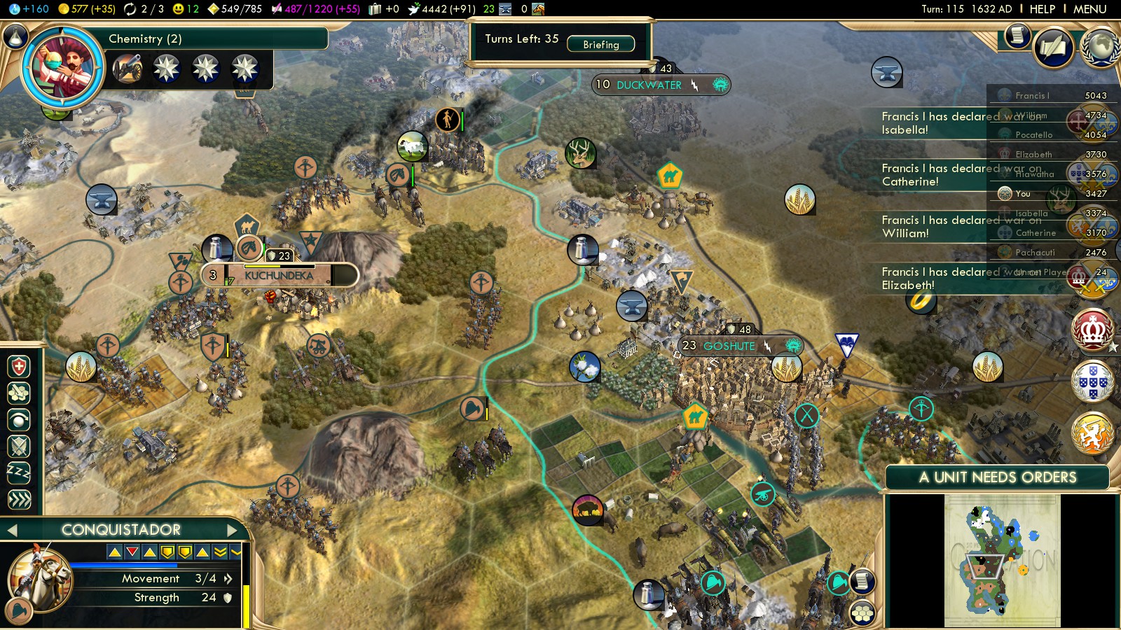 Even as my Comanche Riders (turn 41!) started heading towards the Shoshone, I had already denounced them, putting me on better relationships with the Europeans. (Brown nosing really doesn’t hurt here, as long as they then focus on warring other nations…)