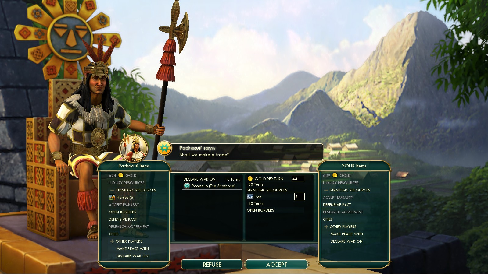 | Pukara Turn 57 +1 🙂 +1 Gold, +1 Faith from Walls. | Mandate of Heaven +20% discount on purchases with Faith. | |