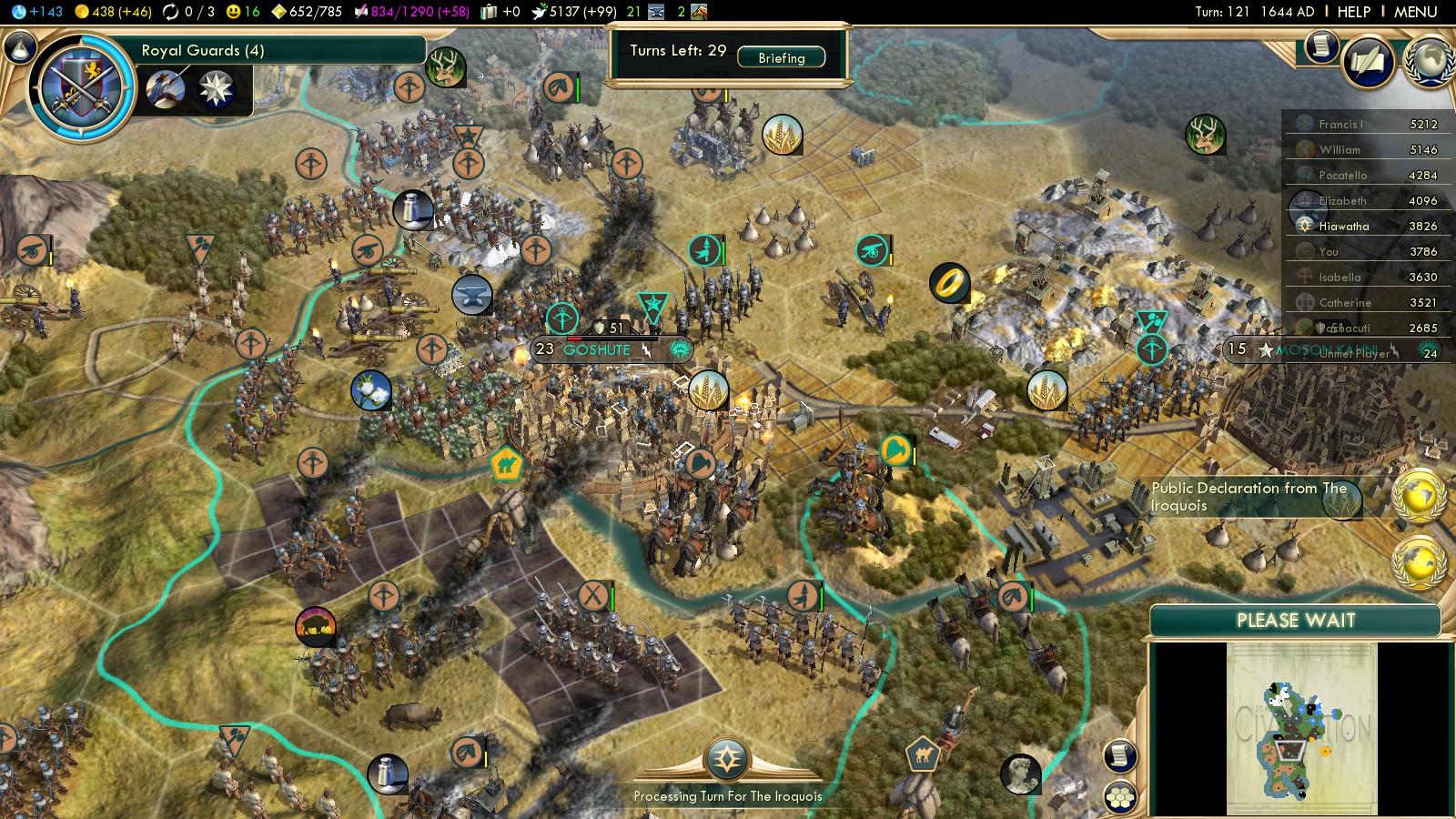 I’ve been at war with the Shoshone from very early on, using Comanche Riders. But even conquering enemy Native cities was never the goal. The primary goals are: