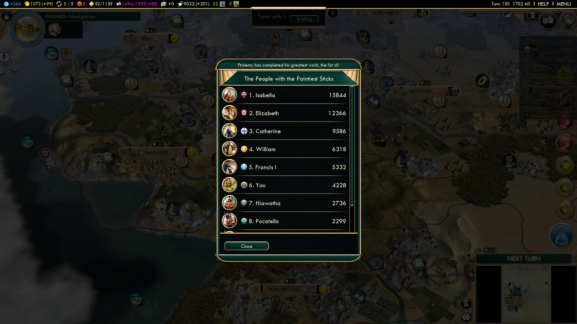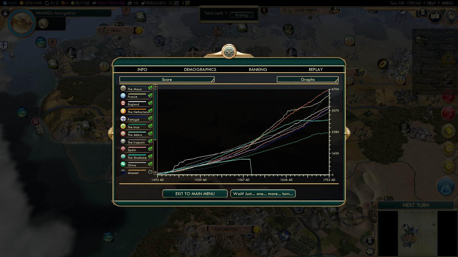 All the above measures made me first catch up in score massively. And even after the Europeans get their “gain double Gold from trade routes” Social Policy, I still could catch up. As you can see in the score graph, every single war the Europeans wage with one another stalls their GPT income for some turns, whilst they pillage each others trade routes. Unfortunately in the end I lost the game to the Netherlands with a devastating 6703 to 6758. 🙁