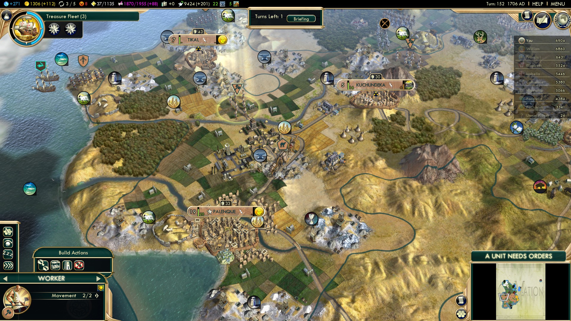 This wonder is essential though: Without it your capital can’t support maintaining one or more specialists and occupying all resource tiles and all special Faith tiles. Furthermore with it your Native American enemies will grow stronger themselves. Improve resources and chop some forests and get Texcotzingo!
