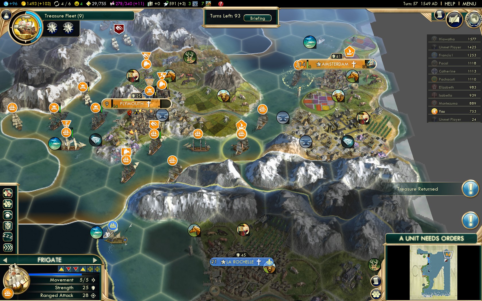 - Turn 59 War with France (La Rochelle: Turn 62, peace turn 66)