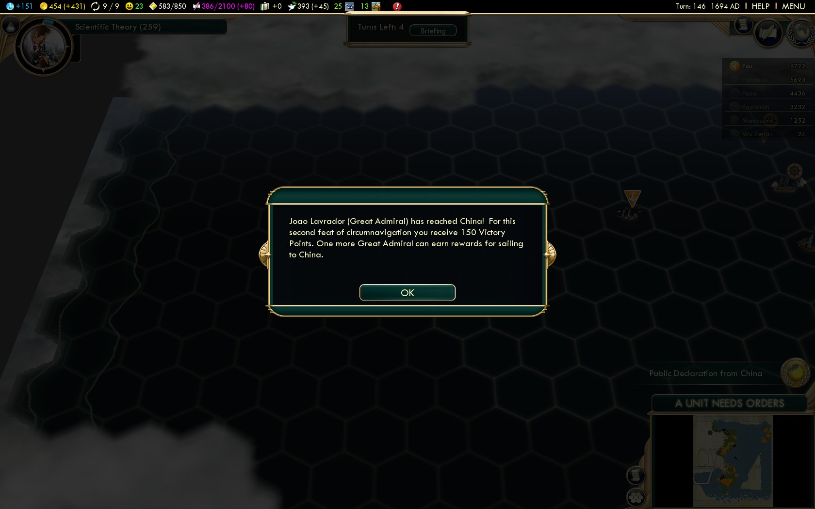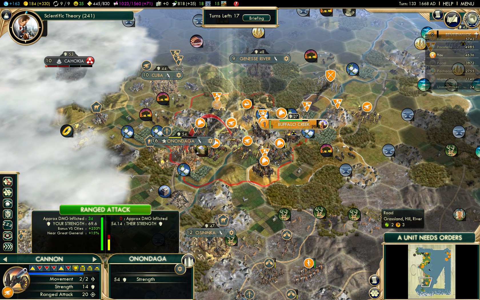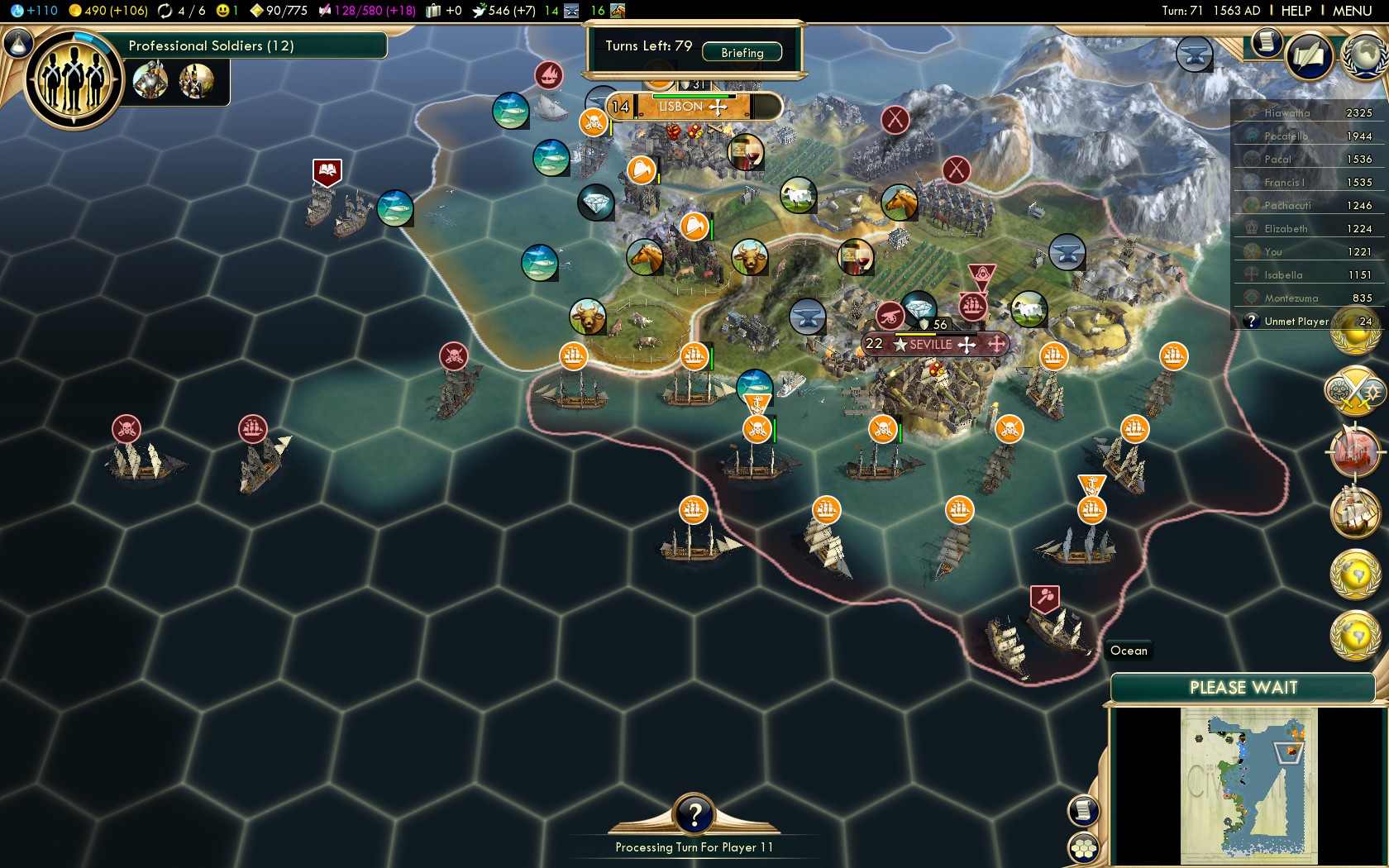 - Turn 69 War with Spain (Seville: Turn 72)