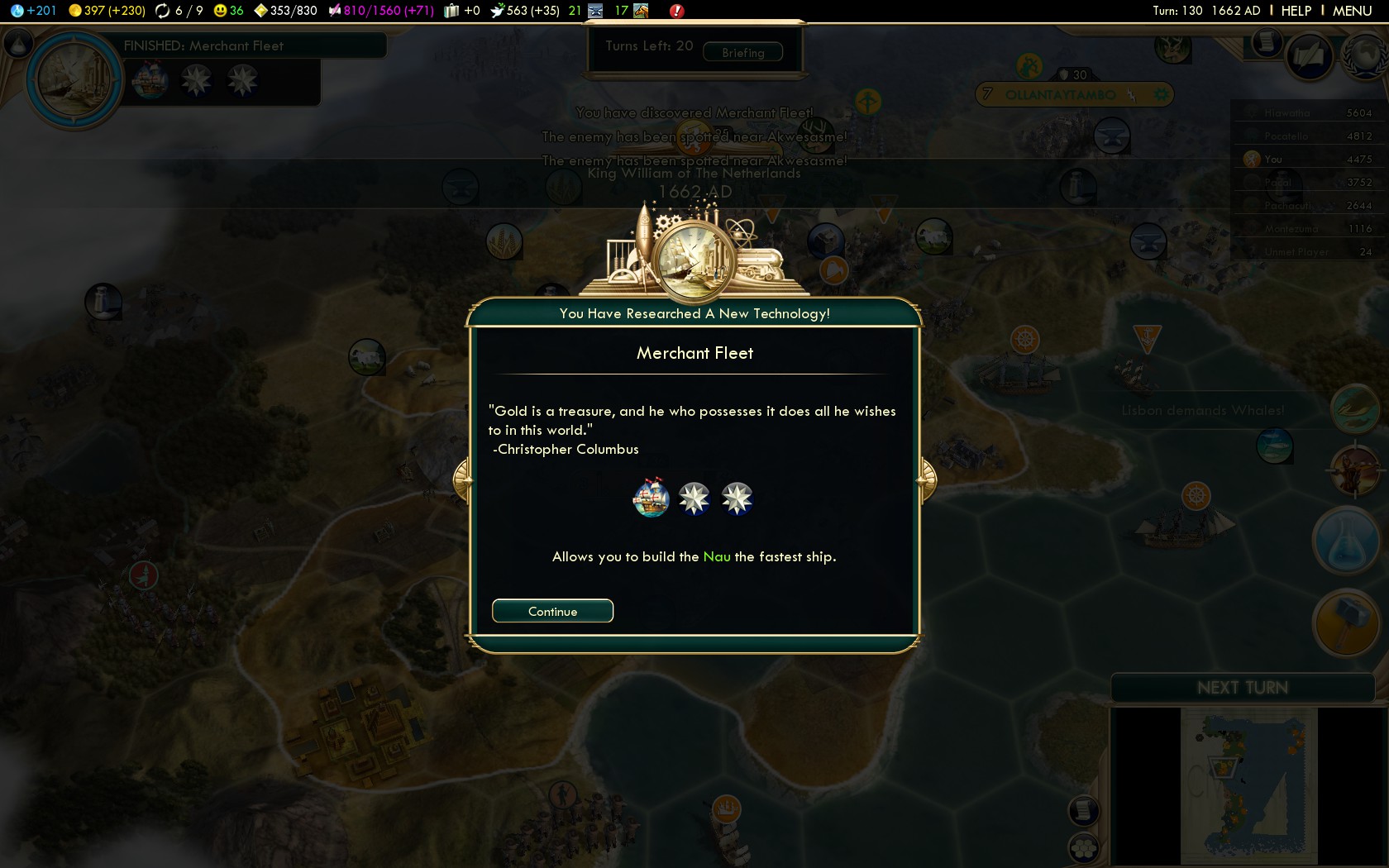 | 15. Privateers 6x — Conquistadores 3x (with Faith) — — Upgrade 4 Galleases (turn 53) — |