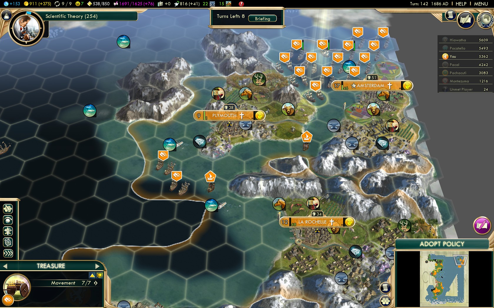 - save treasures until you get the Conquest of the New World Social Policy as this gives you double VP and Gold