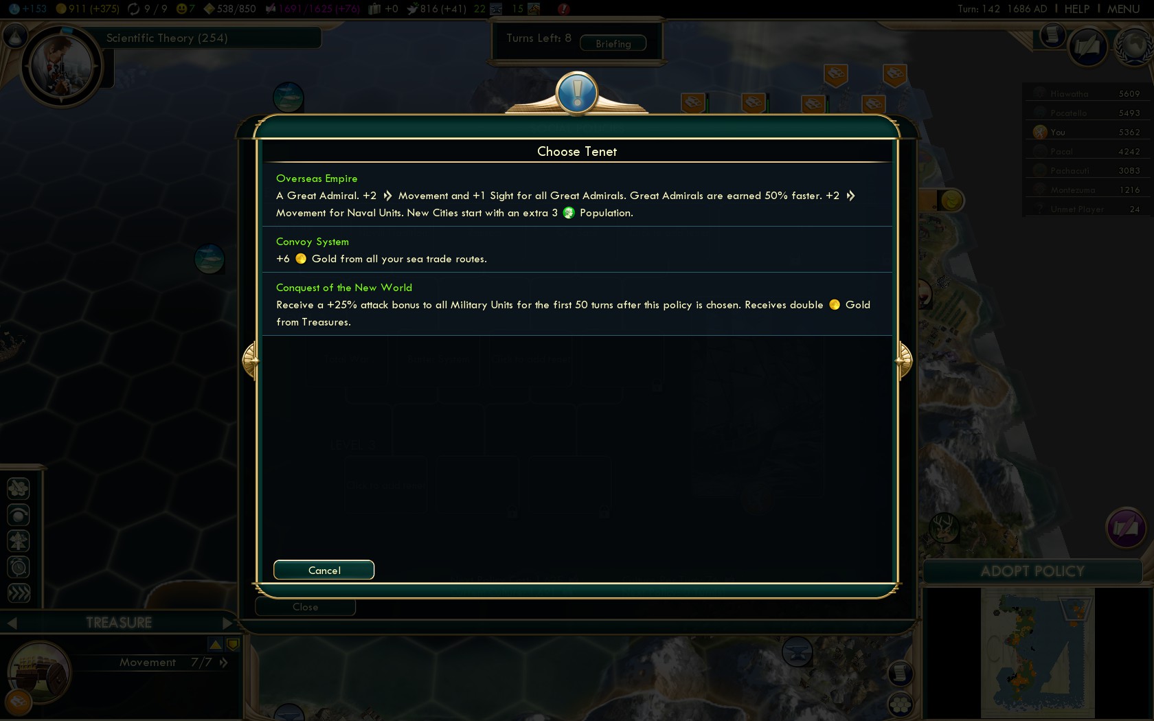 • save treasures until you get the Conquest of the New World Social Policy as this gives you double VP and Gold