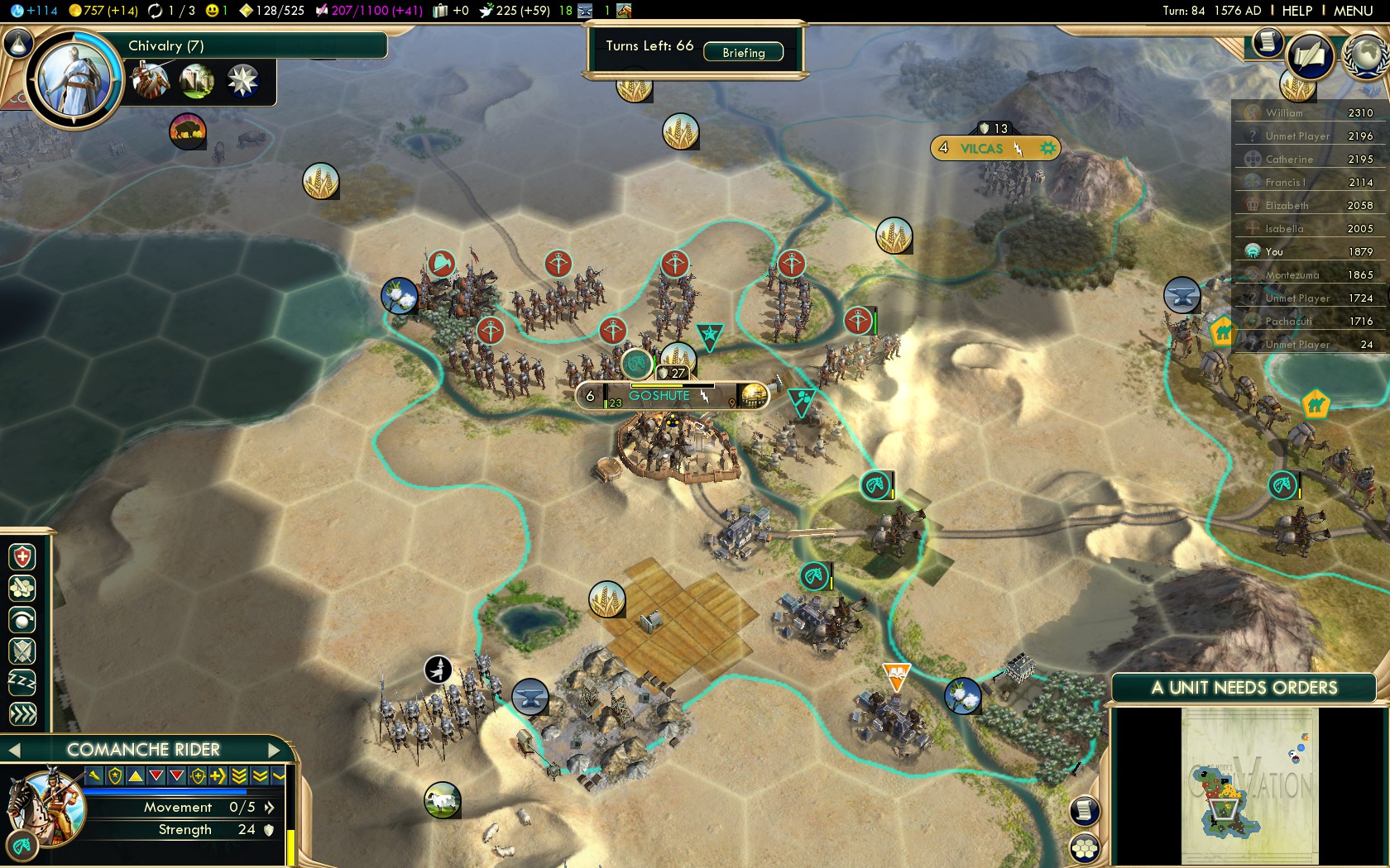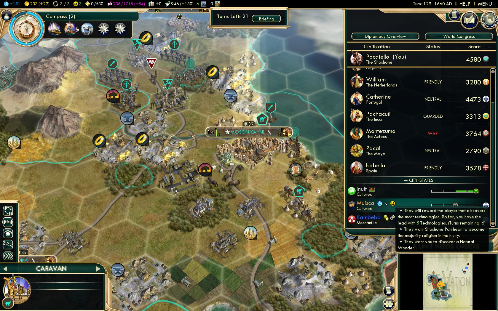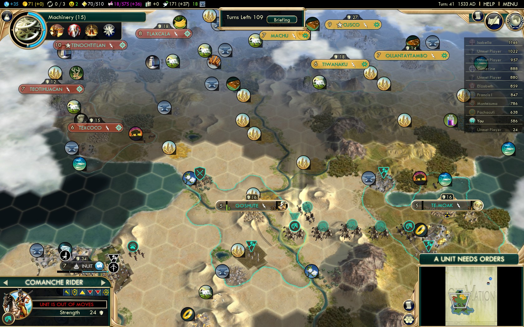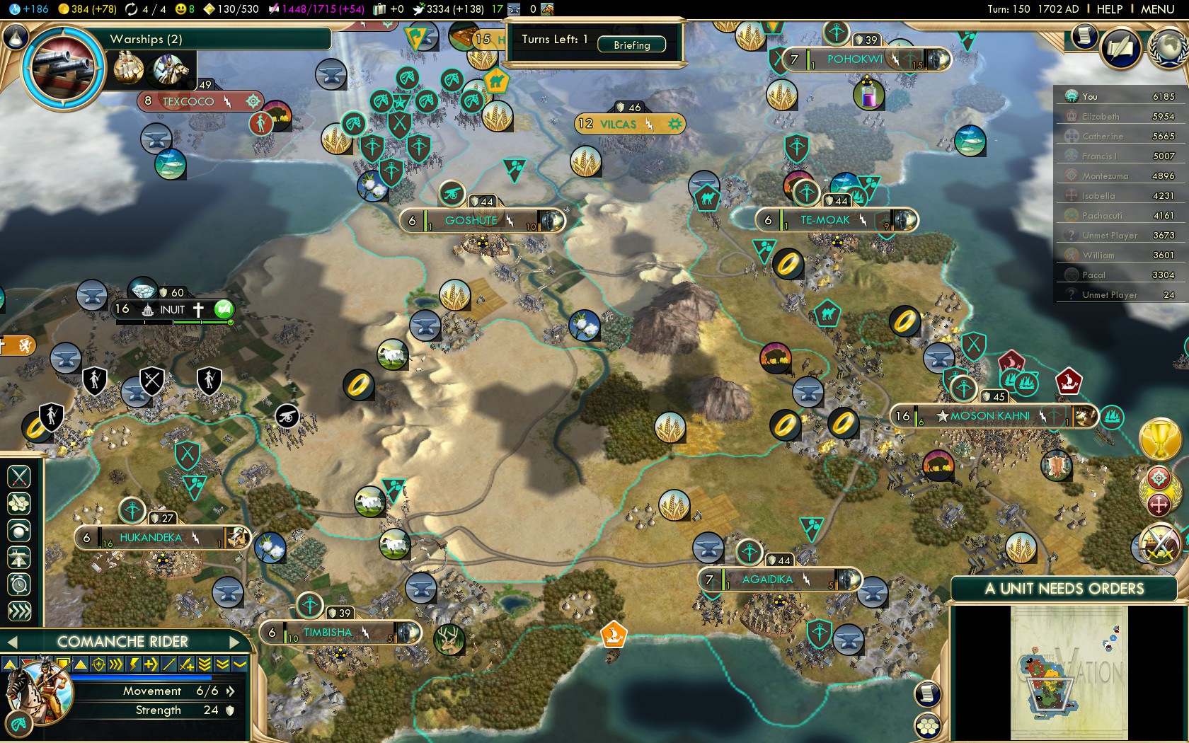 Playing Conquest of the New World as the Shoshone on Deity difficulty, or any Native American civilization for that matter is a bitch. Only with all prerequisites met can one even have a chance to win.