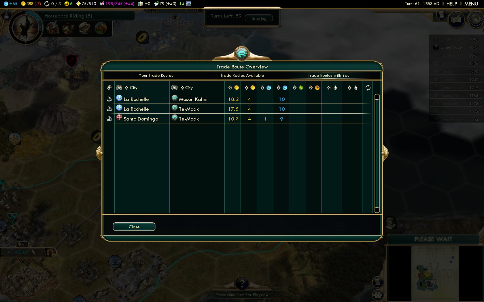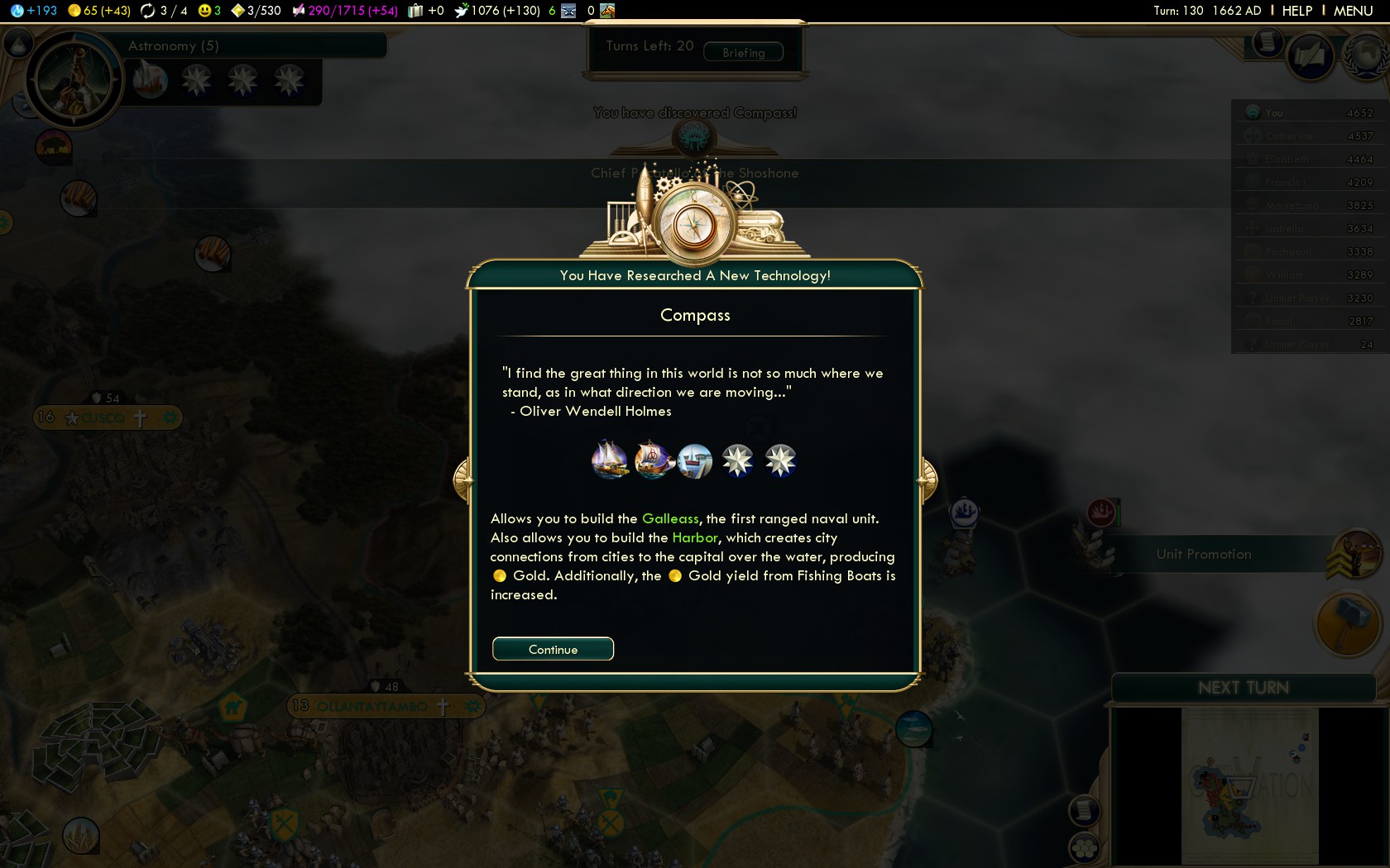 Over the course of the game I came to overthink my advice regarding coastal cities: Maybe a capital by the coast is good. Gave me some early trade routes with the Europeans in which boosted my science income by 100%…