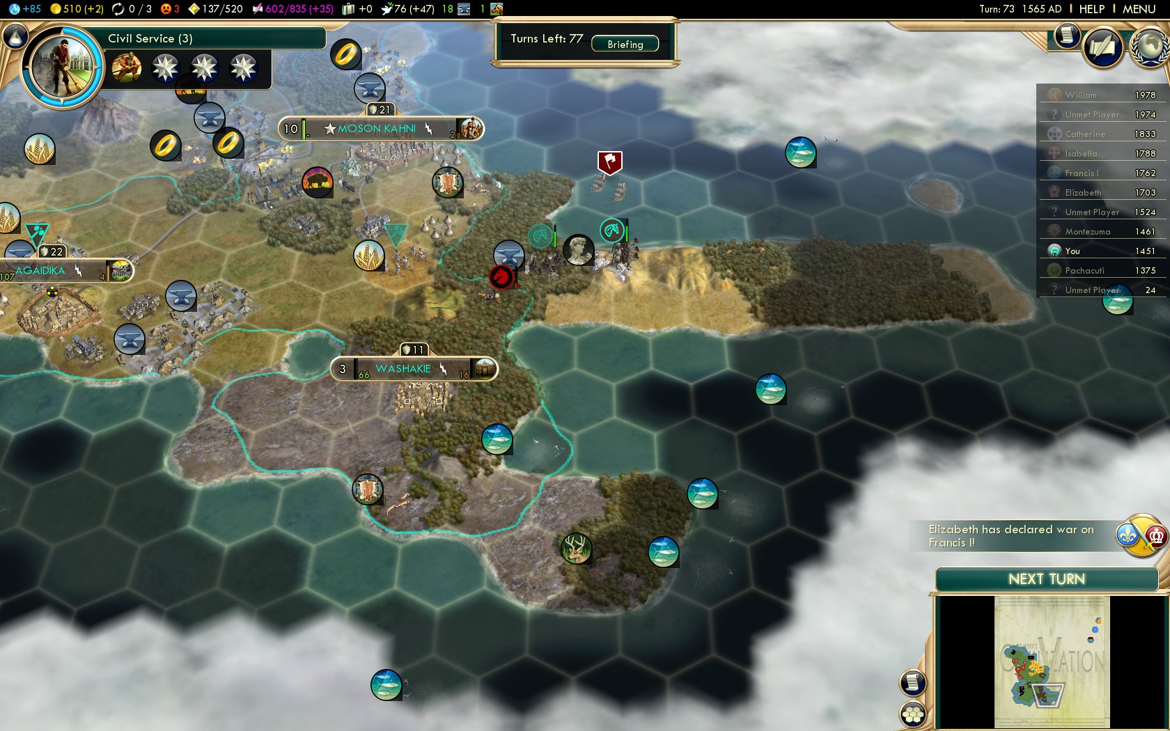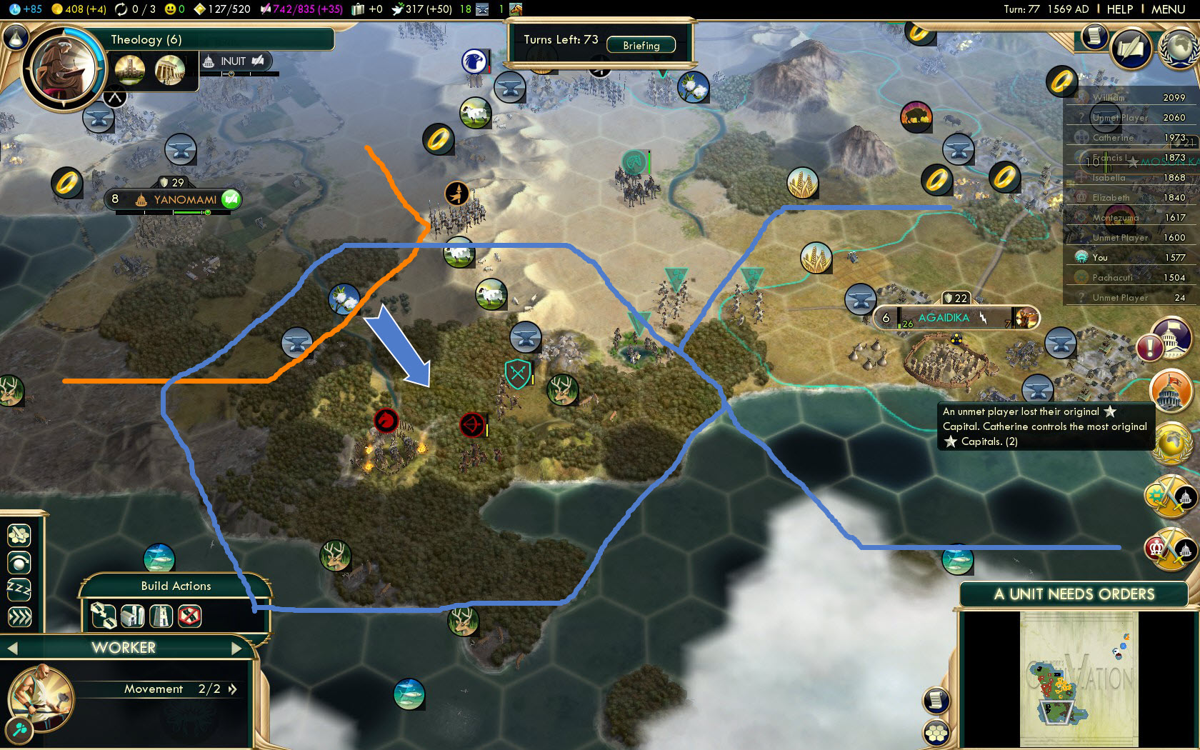 I’ve been at war with the Aztecs from ~turn 41 when I spawned Comanche Riders. Unfortunately even then I could not capture even one single city. So what was the Aztec front in 1533 AD, hadn’t moved much by 1620 AD: