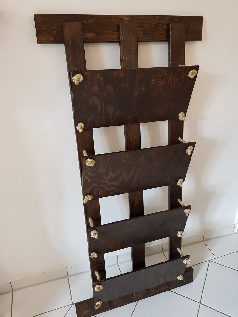 In some years, when we’re bored by it (should that ever happen) we could paint the panels in some crazy colors, label them and more. Also one could use longer pieces of rope and use one of the newspaper compartments as a shelf, perpendicular to the pillars, to store things, even books (probably not too many big ones). So the whole thing is super flexible.