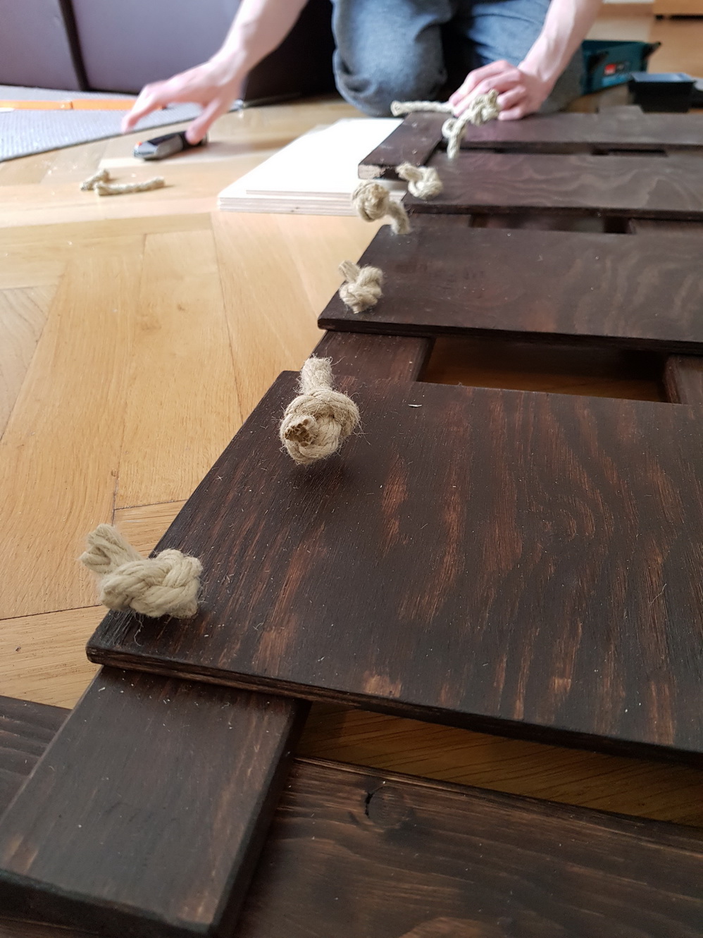 - Pull the pieces of rope through the main pillars’ holes first. Mind that the short pieces of rope have to go in every second hole, as they’ll be the bottom fixation for the panels. One strong knot at the back of the boards will hold the rope.