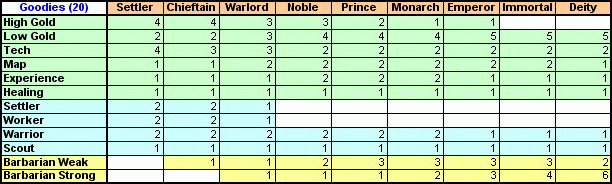 If you find goodie huts and get some money – be happy about it. See the overview on the right: The likelihood for strong barbarians is already 6/20, so 30%, together with weak barbarians the chances for an “unfriendly” encounter is at 40%. Low gold is 25% and the remaining 35% chance to find some actual goodies are shared amongst healing (lame), map (super lame), xp (so so), warriors, scout and tech.