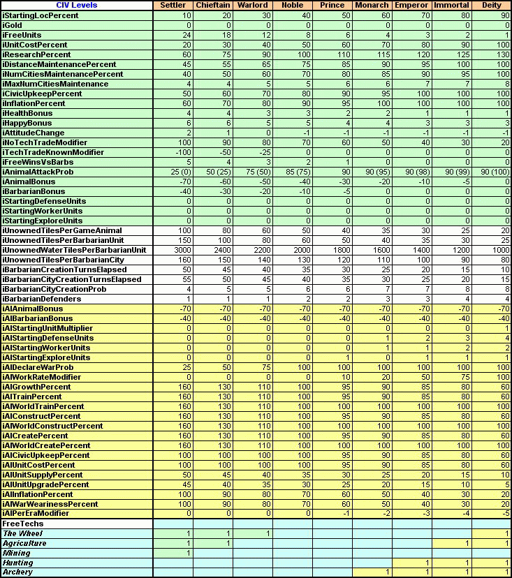 When you start playing Civilization 4 (or any part of Civ for that matter), playing on Settler (lowest) difficulty grants the player various bonuses. On the lower 3 difficulties, you still get bonuses, playing the middle 3 levels of difficulty, the odds are quite even, until on the highest 3 levels the AI gets bonuses – on Deity these are massive. The easiest example is the FreeTechs modifier at the bottom:
