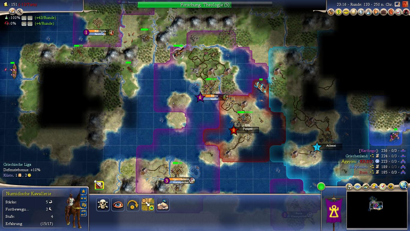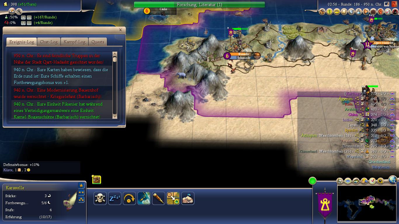 Aside from that you won’t have much fun in early Europe: Barbarians will take too much of your attention, while Romes power is growing. It has to be the other way round: Rome needs to deal with these Barbarian hordes, while you grow your power across the Mediterranean Sea!