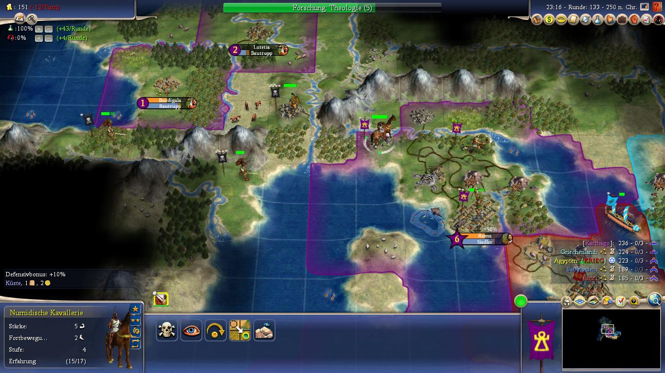 Mercenaries are crucial for achieving the Carthaginian UHV. Otherwise I don’t hold mercenaries in high esteem: They’re deprecated after the middle ages, so why level these units? They’re expensive (except for Carthage) and the initial promotions they come with aren’t that powerful. Bottom line: Carthage is the only civ I hired mercenaries with. In not one single game other than this did I bother with them.