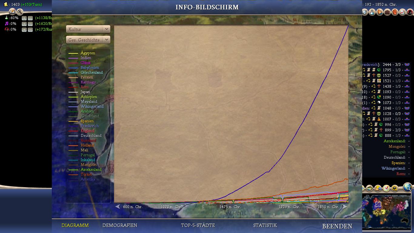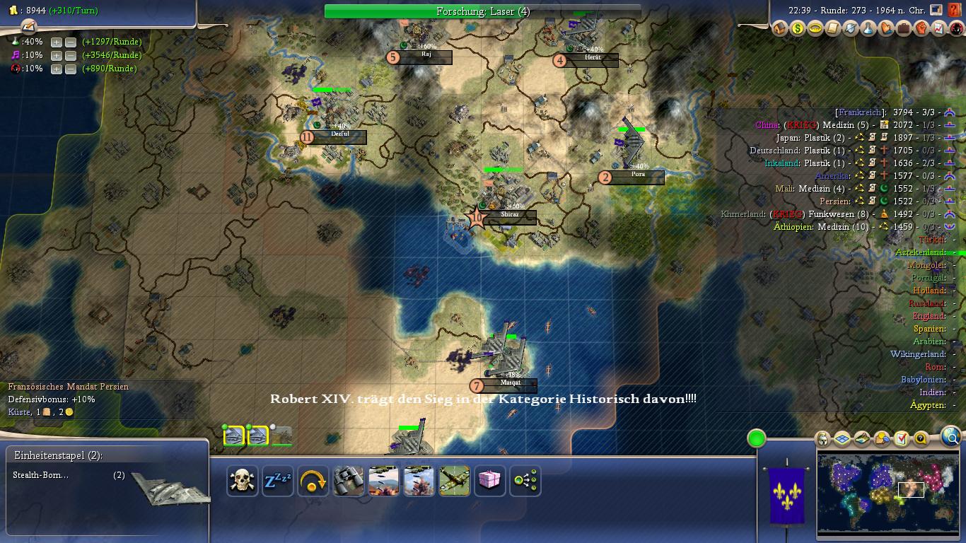 Using Frances unique power I was able to “convince” 5 civilizations to become my vassals. The USA and the Incas as my vassals secure my rule over America. Mali, Egypt and Persia control the middle east and biggest parts of Africa in my name. The rest of the world has barely been colonized, thanks to the absence of the Netherlands and Spain.