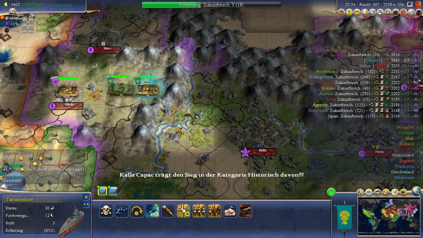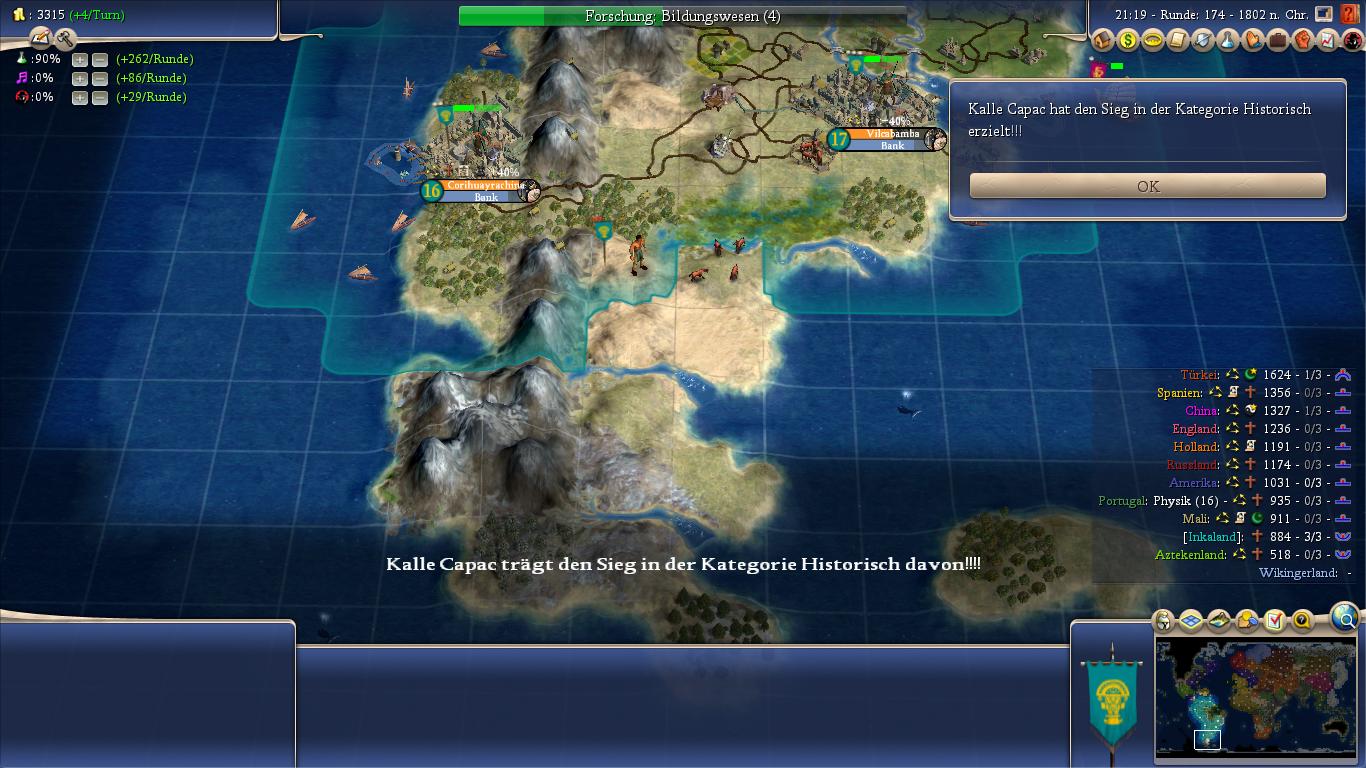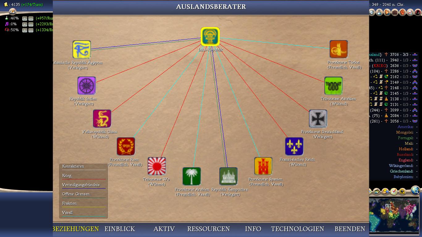 Once I reached the end of the tech tree I started my conquest. By 2040 my Inca empire had vassalized Rome, Spain, Arabia and Turkey. The first two giving me a good bridgehead to Europe, the latter two granting me easy access to Asia.